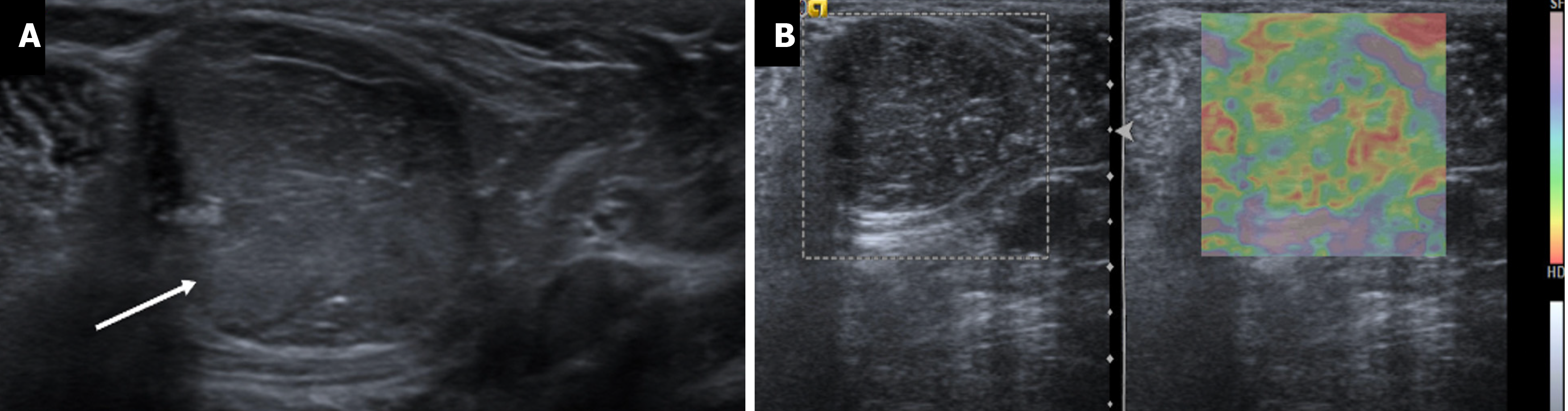 A: Ultrasound; B: Elastography images showing a circumscribed oval homo genous isoechoic mass (white arrow), which appeared soft on elastography.