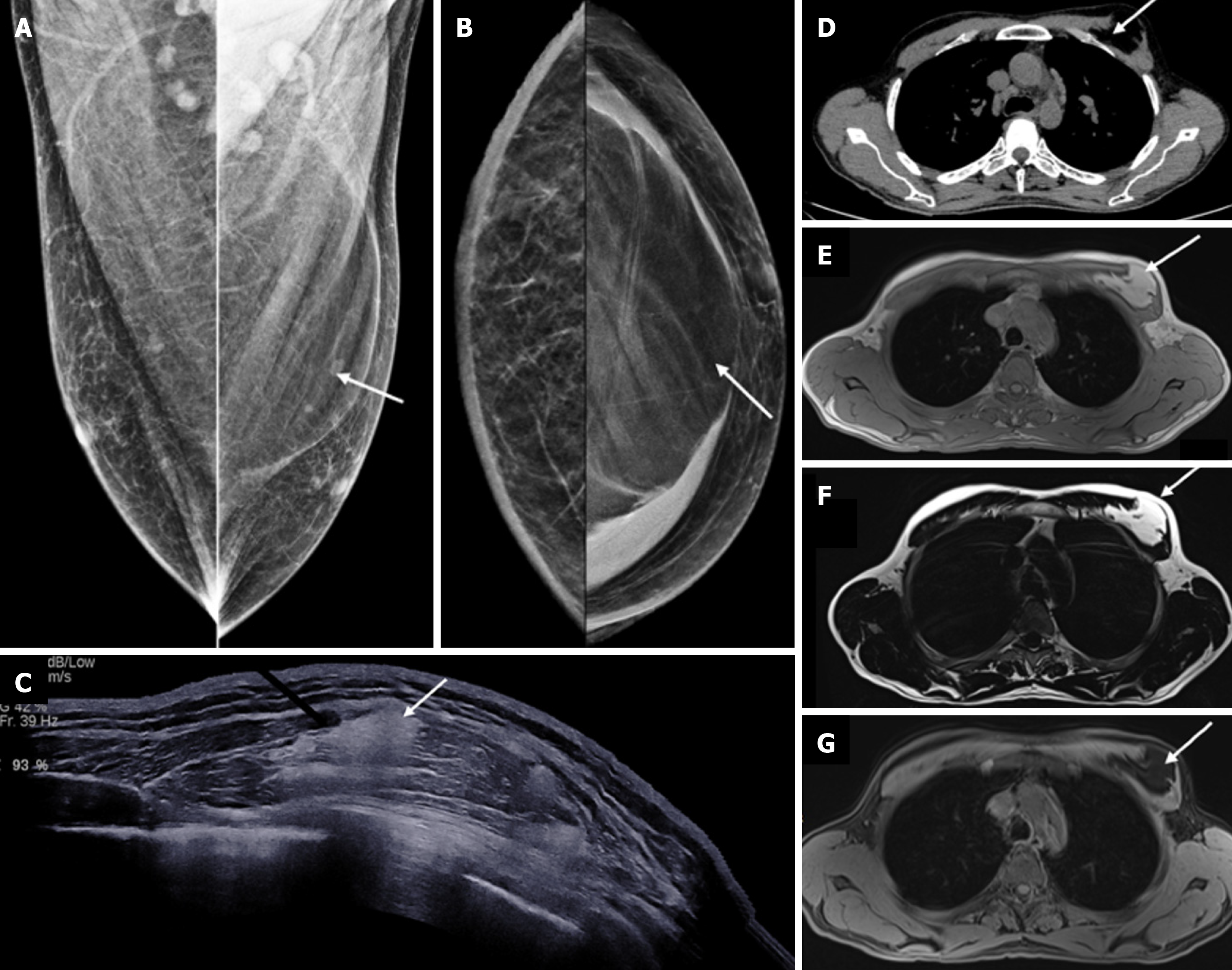A: Mediolateral oblique; B: Craniocaudal mammo graphy views showing a large, circumscribed fat density mass causing splaying of pectoralis muscle fibers in the left breast (arrows); C: Panoramic ultrasound image showing a circumscribed fat-containing echogenic mass in the intrapectoral location (arrow); D: Axial computed tomography image showing fat-containing mass splaying the pectoralis muscle (arrow); E-G: Magnetic resonance images (E: T1-weighted image; F: T2-weighted image; G: T1 fat-saturated image) demonstrating T1 and T2 hyperintense masses with suppression of fat saturation, suggestive of lipoma (arrows).