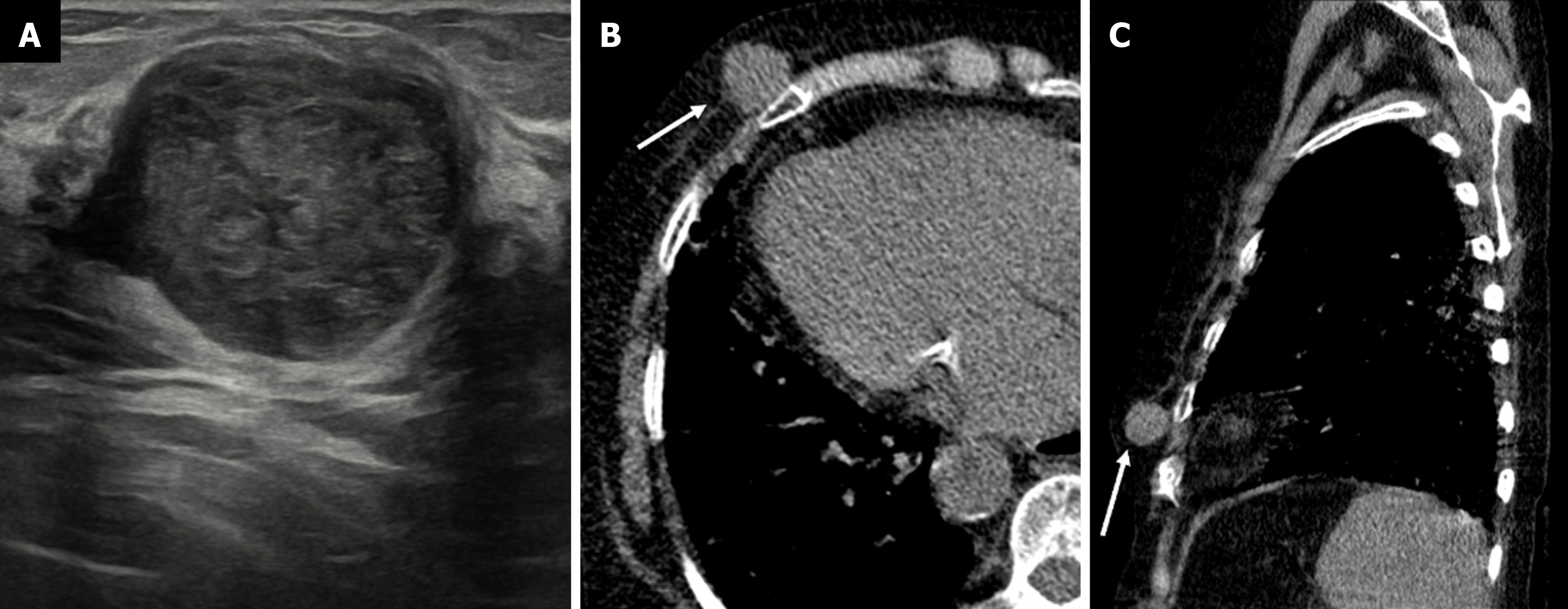 A: Ultrasound image showing a round circumscribed heterogeneously hypoechoic mass; B: Axial; C: Sagittal noncontrast computed tomography sections demonstrating a well-defined hypoattenuating soft tissue density mass in the right breast (white arrows) with no calcifications or chest wall invasion.