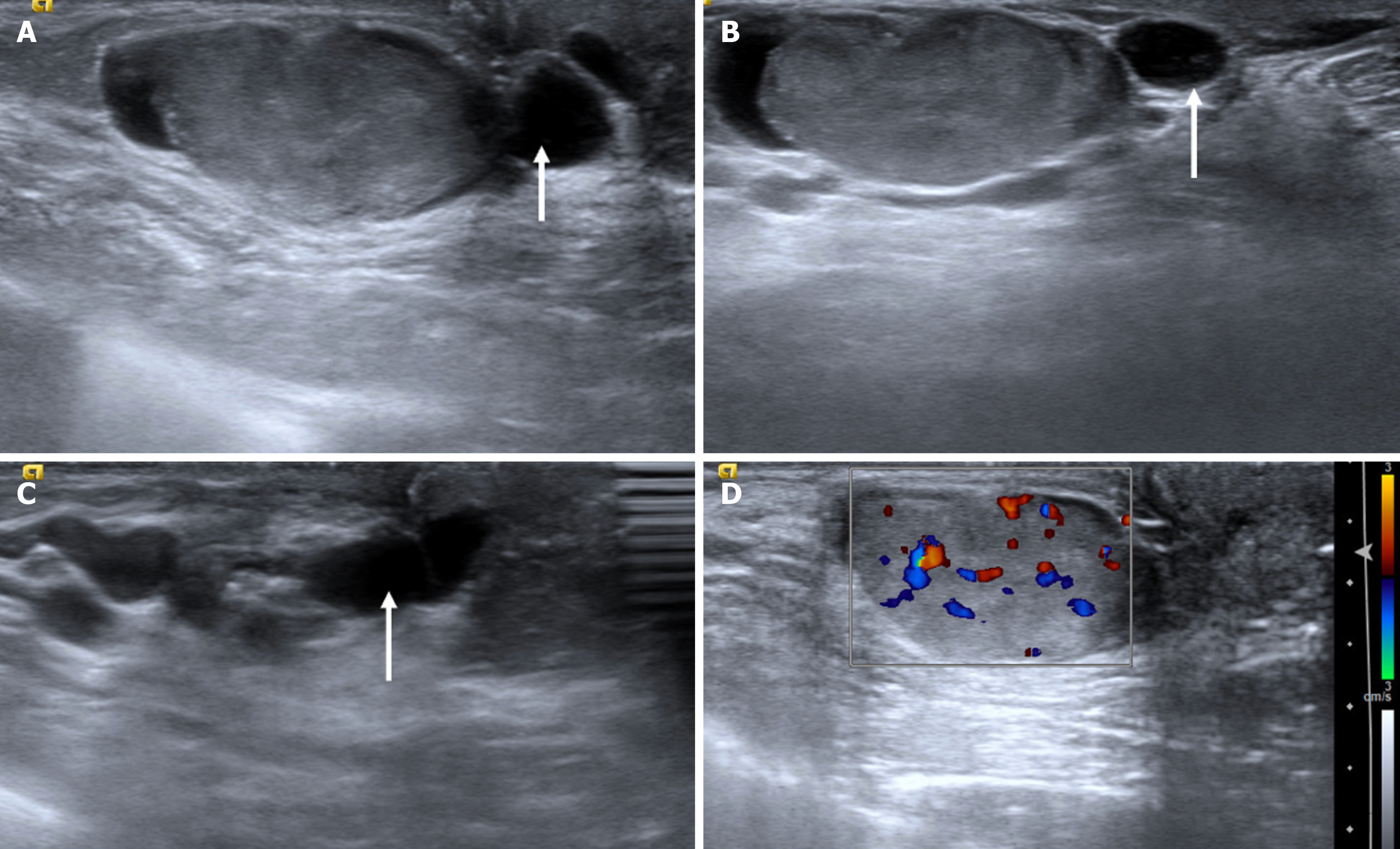 A-C: Ultrasound; D: Color Doppler images showing a circumscri bed, oval, slightly hypoechoic, solid mass within a dilated duct (white arrows) with internal vascularity.
