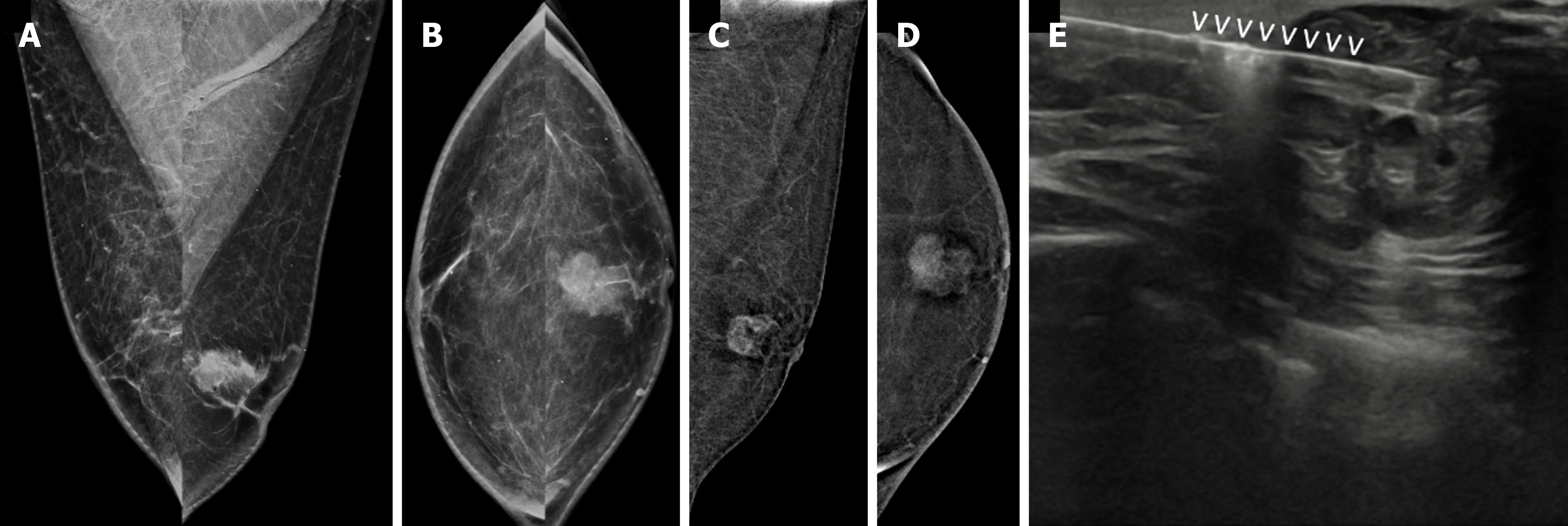 A: Mediolateral oblique (MLO) view; B: Cra niocaudal (CC) mammography view showing an irregular, high-density mass with indistinct margins in the retroareolar location with surrounding architectural distortion and nipple retraction; C and D: Contrast-enhanced mammography; C: MLO; D: CC views of recombined images showing heterogeneous postcontrast enhancement of the mass; E: Ultrasound-guided core needle biopsy image of the mass depicting the heteroechoic mass (needle denoted by vvvvv), with histopathology initially revealing ductal carcinoma in situ. Subsequent surgery, however, revealed invasive cancer.