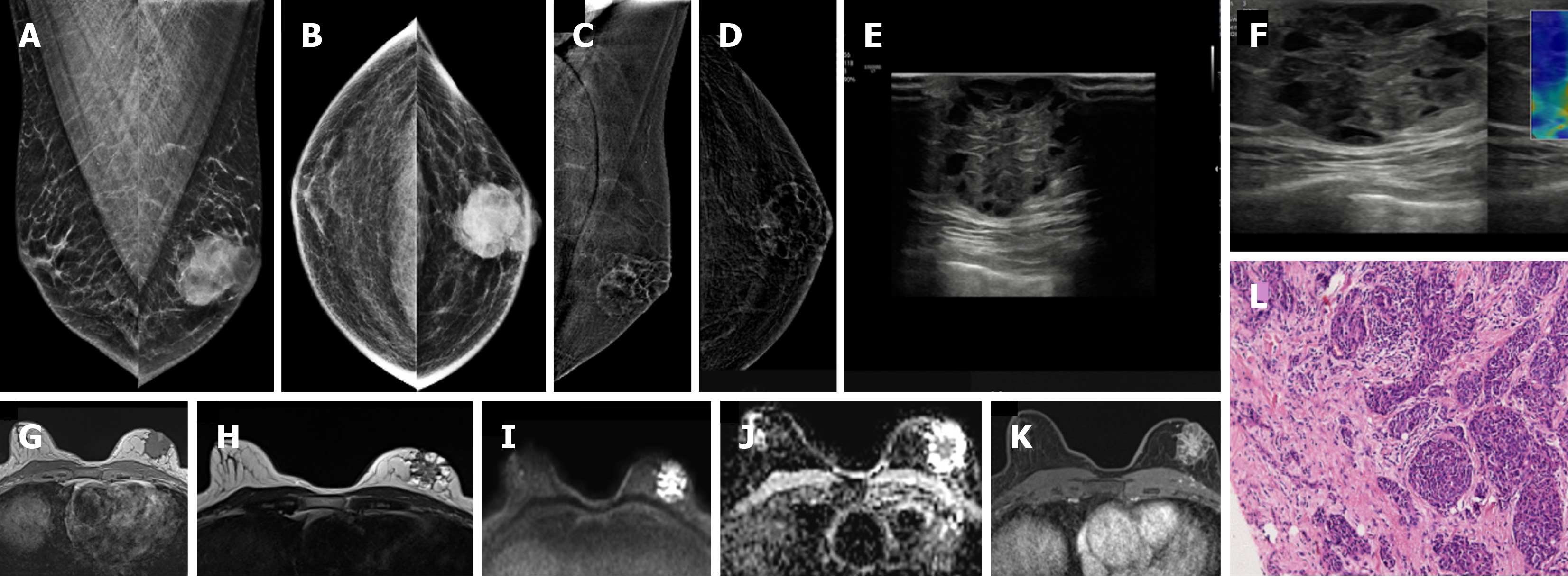 A: Mediolateral oblique (MLO) view; B: Craniocaudal (CC) view showing an irregular, high-density mass; C and D: Contrast-enhanced mammography; C: MLO and D: CC views of the recombined images showing heterogeneous enhancement; E: Ultrasound; F: Elastography images showing an irregular heteroechoic mass with microlobulated margins that appear hard on elastography; G-J: Magnetic resonance images showing an irregular mass; G: T1-weighted image showing a hypointense signal; H: T2-weighted image showing a heterogeneously hyperintense signal; I and J: DWI-ADC images showing central diffusion restriction; K: Postcontrast image showing heterogeneous septal enhancement; L: Histopathological examination image (hematoxylin–eosin, × 40) showing invasive breast cancer (no special type) composed of tumor cells arranged in clusters and tubules.