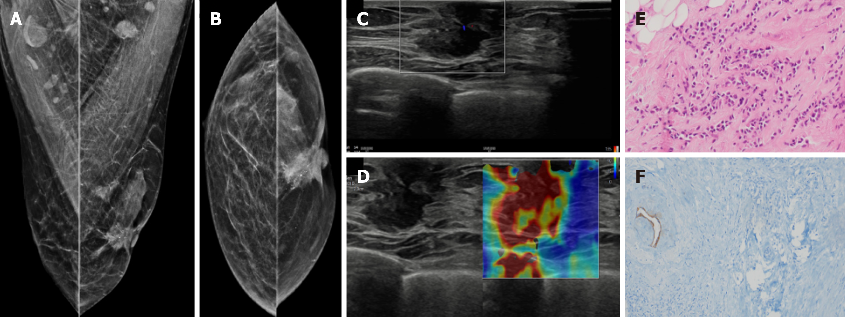 A: Mediolateral oblique; B: Craniocaudal mammography views showing an irregular high-density mass with spiculated margins, few punctate calcific foci and surrounding architectural distortion. Nipple retraction and overlying skin thickening are also observed; C: Ultrasound; D: Elastography images show an irregular mass with angular margins, which appears hard on elastography; E: Histopathology (hematoxylin and eosin, × 40); F: E-cadherin images show medium to small dyscohesive cells that lack E-cadherin expression.