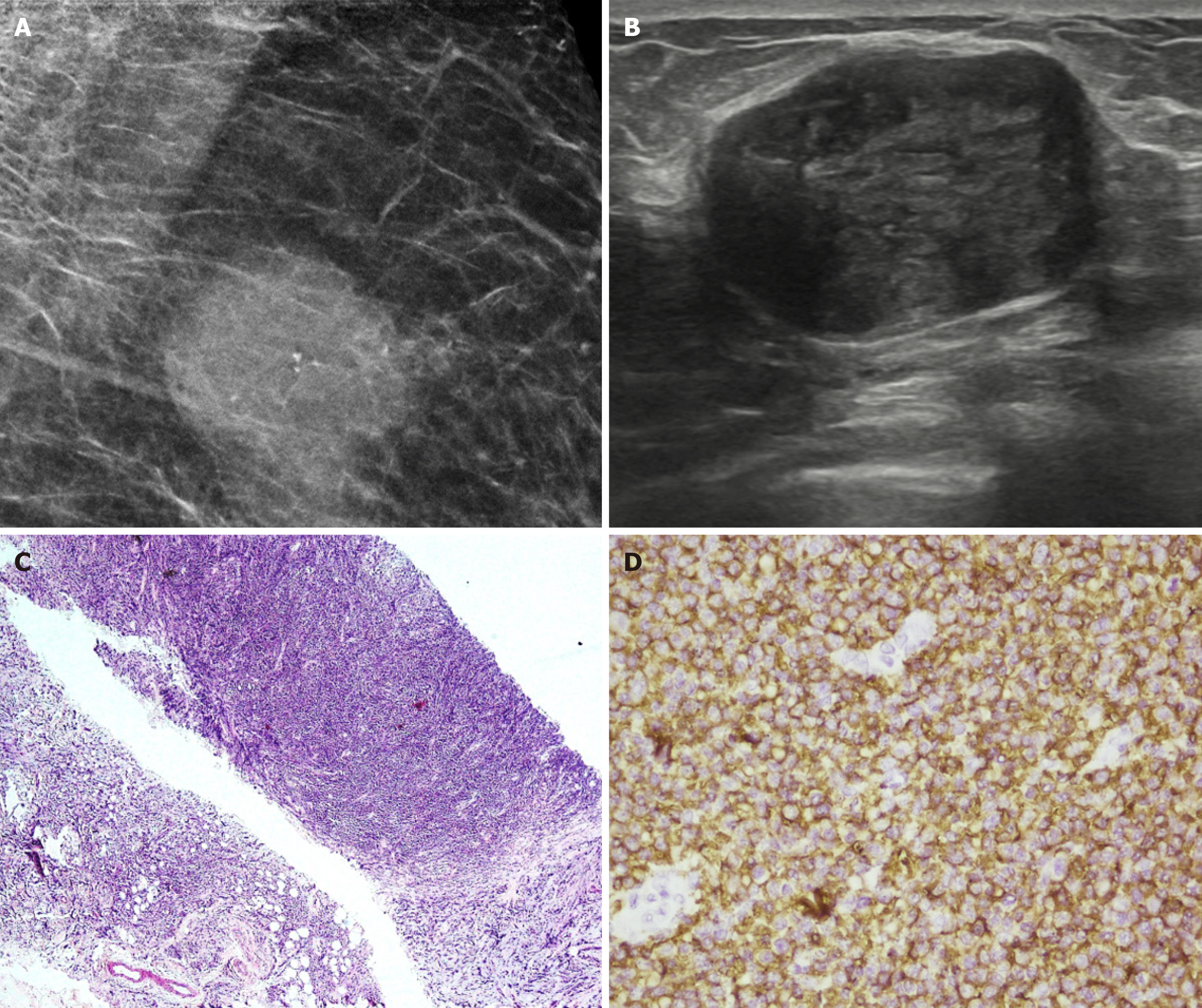 A: Magnified mediolateral oblique view of the right breast showing a round high-density mass with partially indistinct margins and few punctate calcifications. B: Ultrasound image showing an oval hypoechoic parallel mass with circumscribed margins. C: Histopathology (hematoxylin and eosin, × 40). D: CD20 immunohistochemical staining revealed diffuse large B-cell lymphoma with sheets of atypical lymphoid cells that were positive for CD20.
