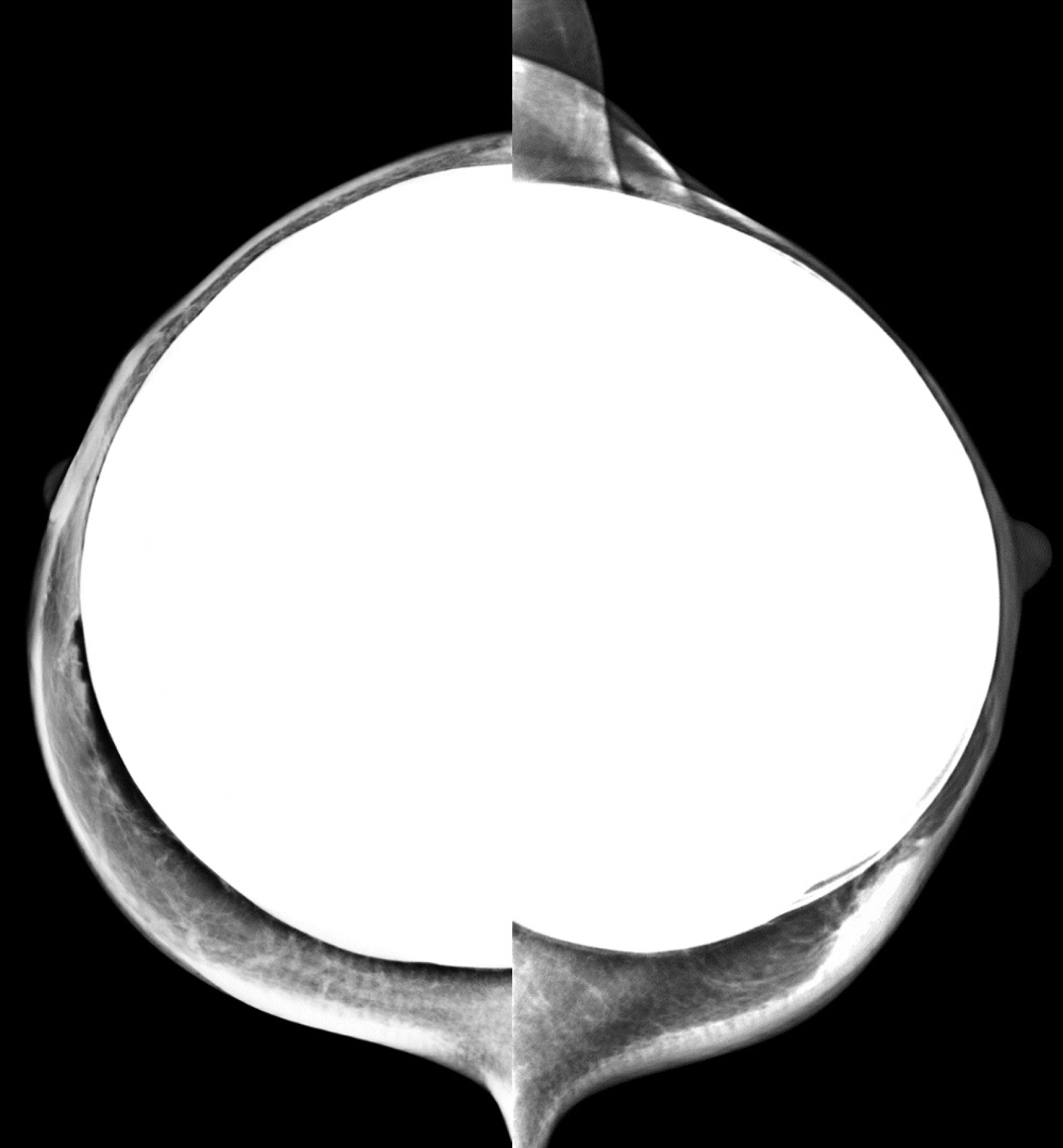 Craniocaudal mammogram of a transfeminine (male to female) individual showing bilateral silicone implants with smooth margins and no signs of rupture.