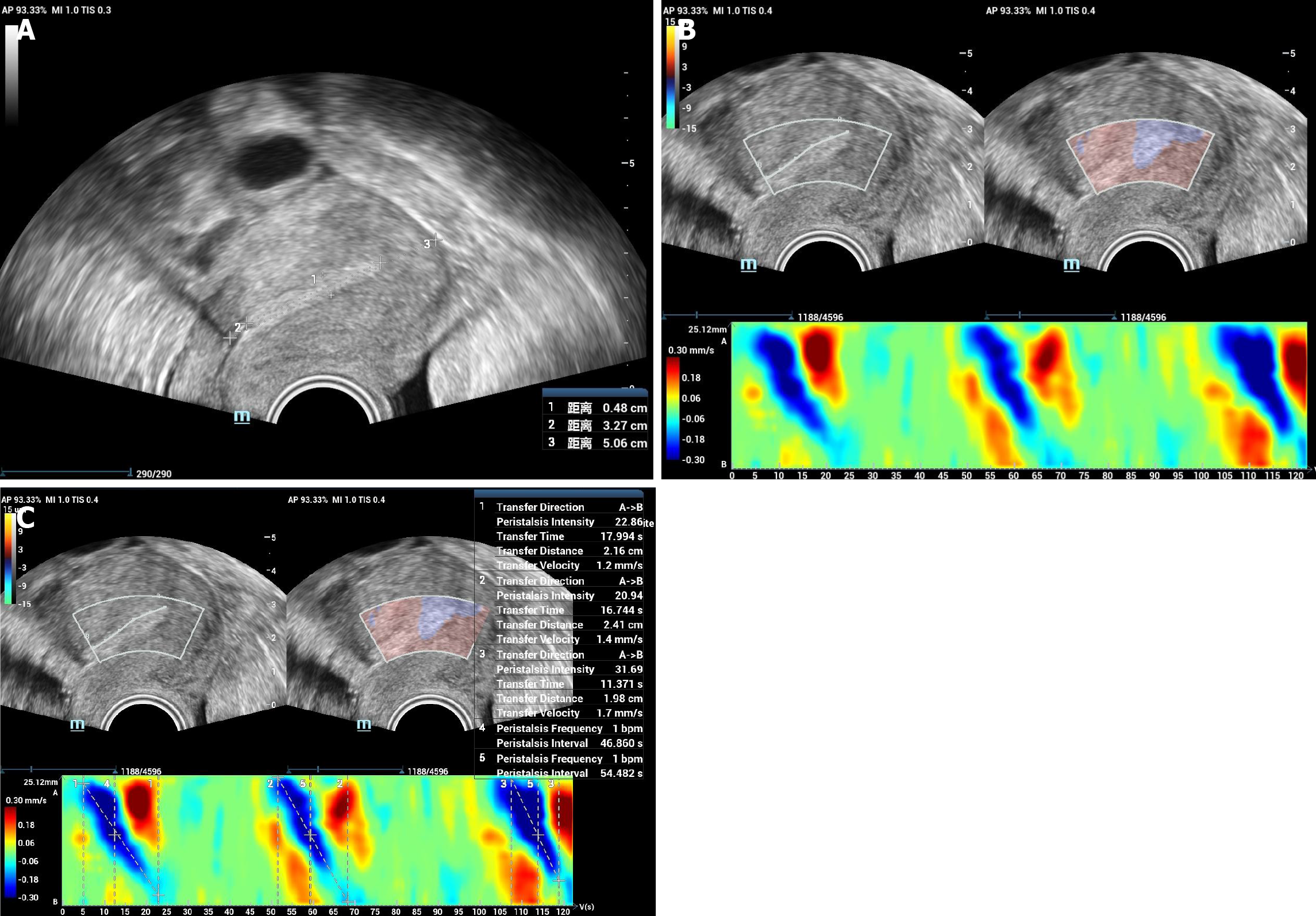 A: Conventional ultrasound showed a normal uterus; B: Endometrial peristalsis analysis technique showed endometrial peristalsis with color code image; C: Quantitative analysis of figure B with quantitative parameters acquired including transfer direction, peristalsis intensity, transfer distance, transfer time, transfer velocity and peristalsis frequency.