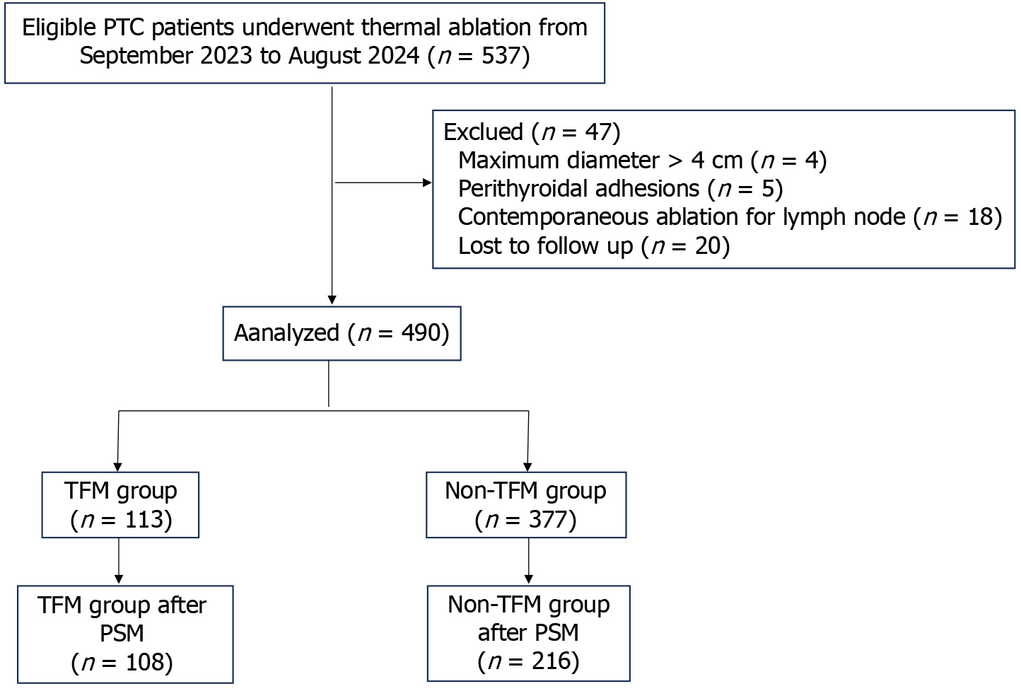 PTC: Papillary thyroid carcinoma; TFM: Thermal field management; PSM: Propensity score matching.
