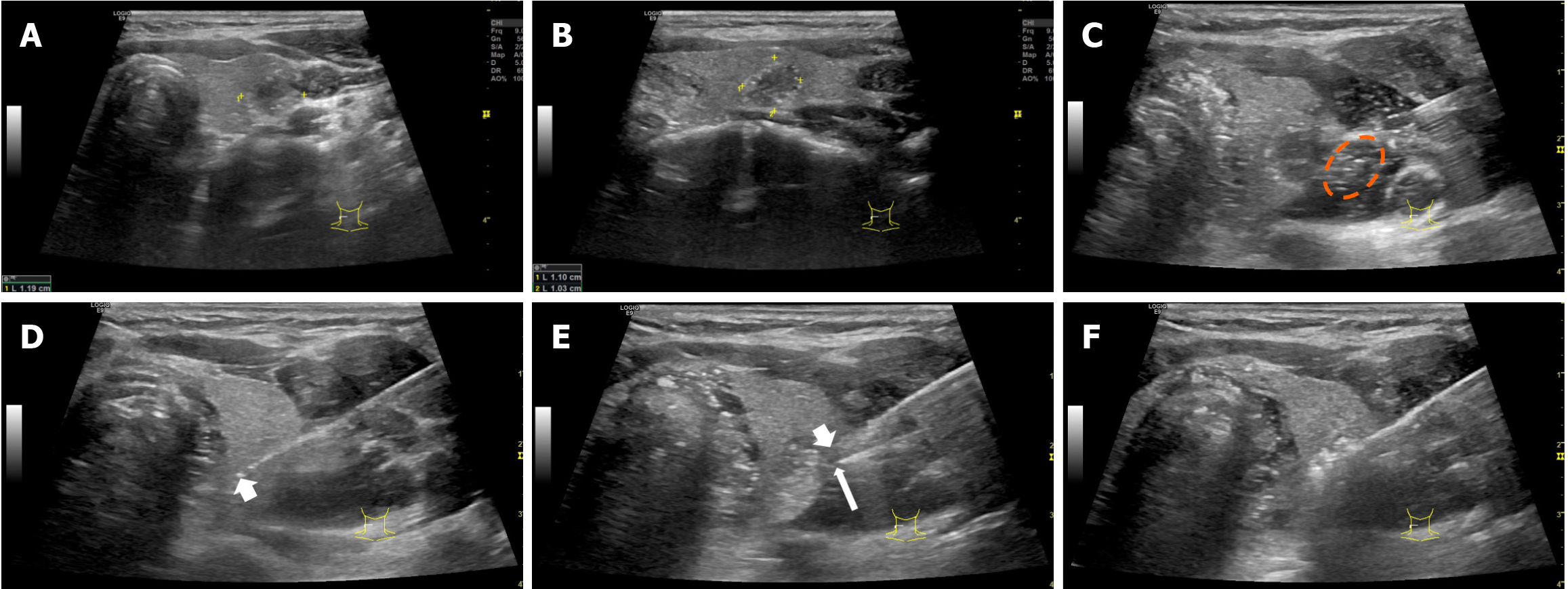 A and B: Longitudinal and transverse pre- radiofrequency ablation ultrasound images show a hypoechoic solid nodule (1.2 cm × 1.1 cm × 1.0 cm) abutting the thyroid capsule; C: Tissue adhesions from tumor invasion impeded formation of an effective fluid barrier between the capsule and surrounding tissue (orange dashed circle); D: The active needle tip extended ≥ 2 mm beyond the original tumor margin (upper boundary on the image) without penetrating the capsule (thick arrow); E: The hydrodissection needle tip (thin arrow) was placed flush against the capsule at the site of heat leakage along the ablation needle shaft (thick arrow), with continuous injection of isolating fluid; F: Heat generated by the active tip was completely confined within the thyroid lobe, and the patient had no discomfort or hoarseness after the procedure.