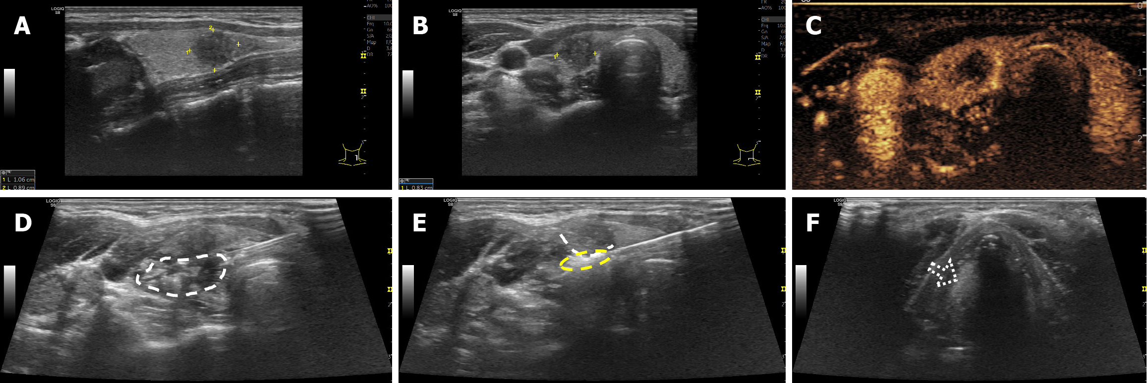 A and B: Longitudinal and transverse pre-microwave ablation ultrasound (US) images show a hypoechoic solid nodule measuring 11 cm × 0.9 cm × 0.8 cm; C: Pre-ablation contrast-enhanced US demonstrates hypoenhancement in the arterial phase; D: No effective fluid isolation zone was formed between the thyroid capsule and surrounding tissue (dashed circle); E: The active needle tip penetrated the thyroid capsule, and heat leakage (yellow dashed circle) was observed outside the capsule (dashed line); F: Immediately after treatment, the patient developed hoarseness; US revealed paralysis of the left vocal cord, fixed at the median position (dashed arrow).