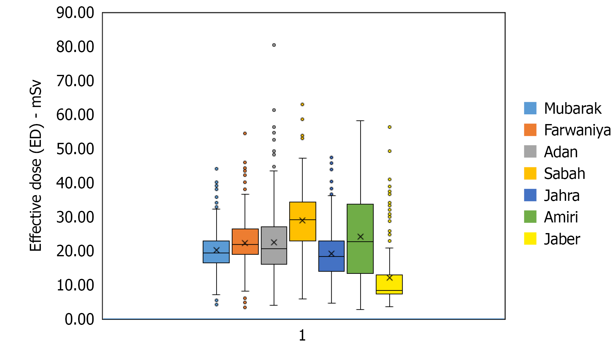 Figure 4 Box plot comparing whole-body computed tomography effective dose across each radiology department, showing the overall pattern of dose distribution.