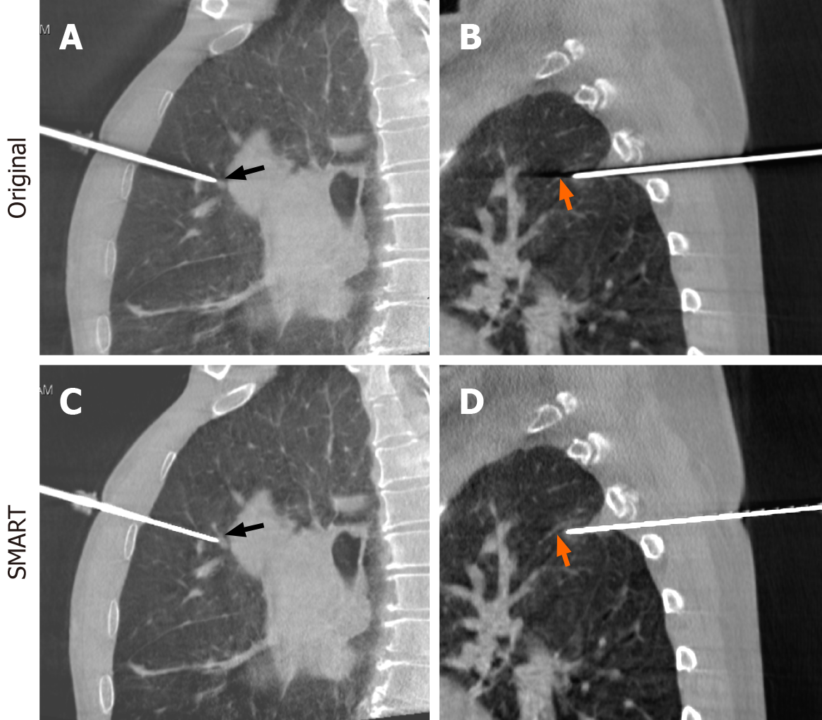 A and B: Original cone-beam computed tomography images; C and D: After streak metal artifact reduction technique reconstruction, the vessels can be clearly visualized as indicated by the arrows. SMART: Streak metal artifact reduction technique.