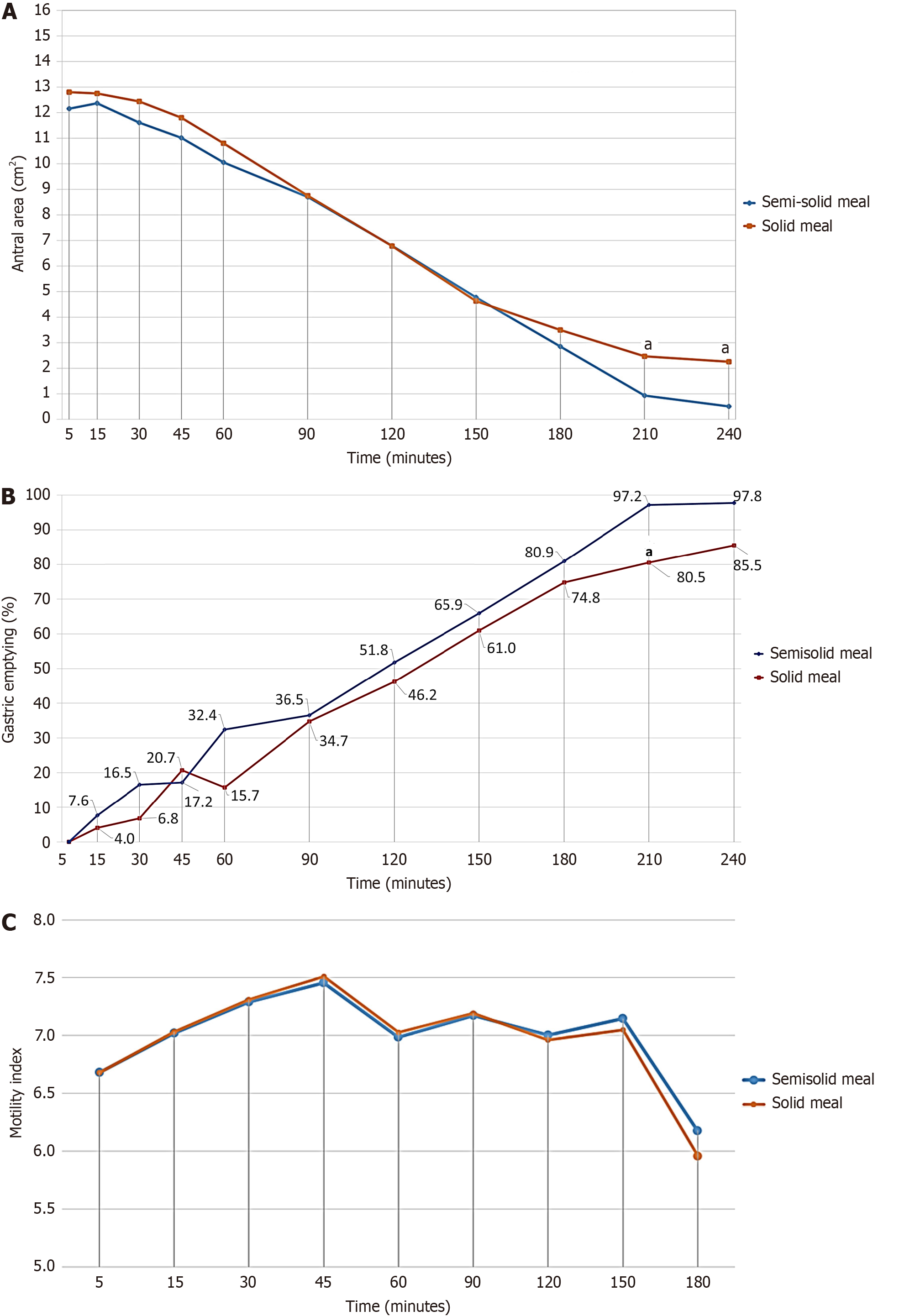Core Tip: Semisolids are commonly believed to empty from the stomach faster than solids, with a significantly shorter lag time. However, using semisolid and solid meals of identical volume and nutritional composition, we demonstrated that gastric emptying rates and antral motor activities were comparable for both meal types up to three hours post-ingestion, with similar half-emptying times. Real-time ultrasonography using a pre-prepared, commercially available, and culturally acceptable semisolid test meal proved to be a reliable and valid method for assessing gastric emptying. This approach offers an effective alternative to traditional solid meal gastric emptying measurements.