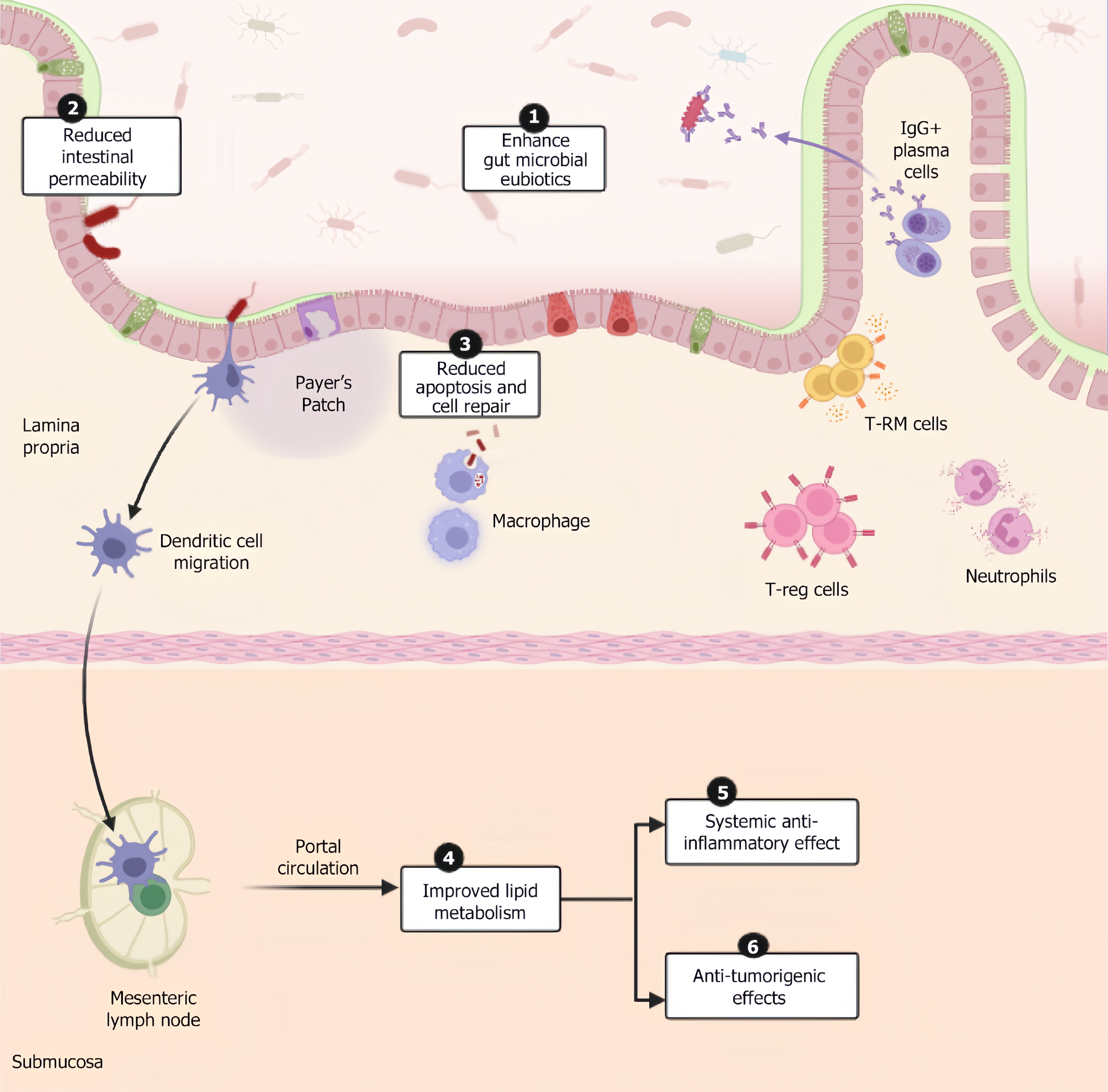 This includes (1) Enhancement of gut eubiosis, favouring commensal species while suppressing pathogenic strains; (2) Strengthening intestinal integrity by upregulation of occludins, tight junctions etc.; (3) Enhanced epithelial regeneration and mucosal healing promotes cell repair and reduces apoptosis; (4) Improved transit of lipid metabolites with enhanced processing at liver resulting in reduced pro-inflammatory lipid mediators; (5) Modulation of immune cells reduces excessive inflammation; and (6) Reduction of chronic inflammation and regulation of metabolism lowers the risk of malignant transformation. IgG: Immunoglobulin G; T-RM: Resident memory T.