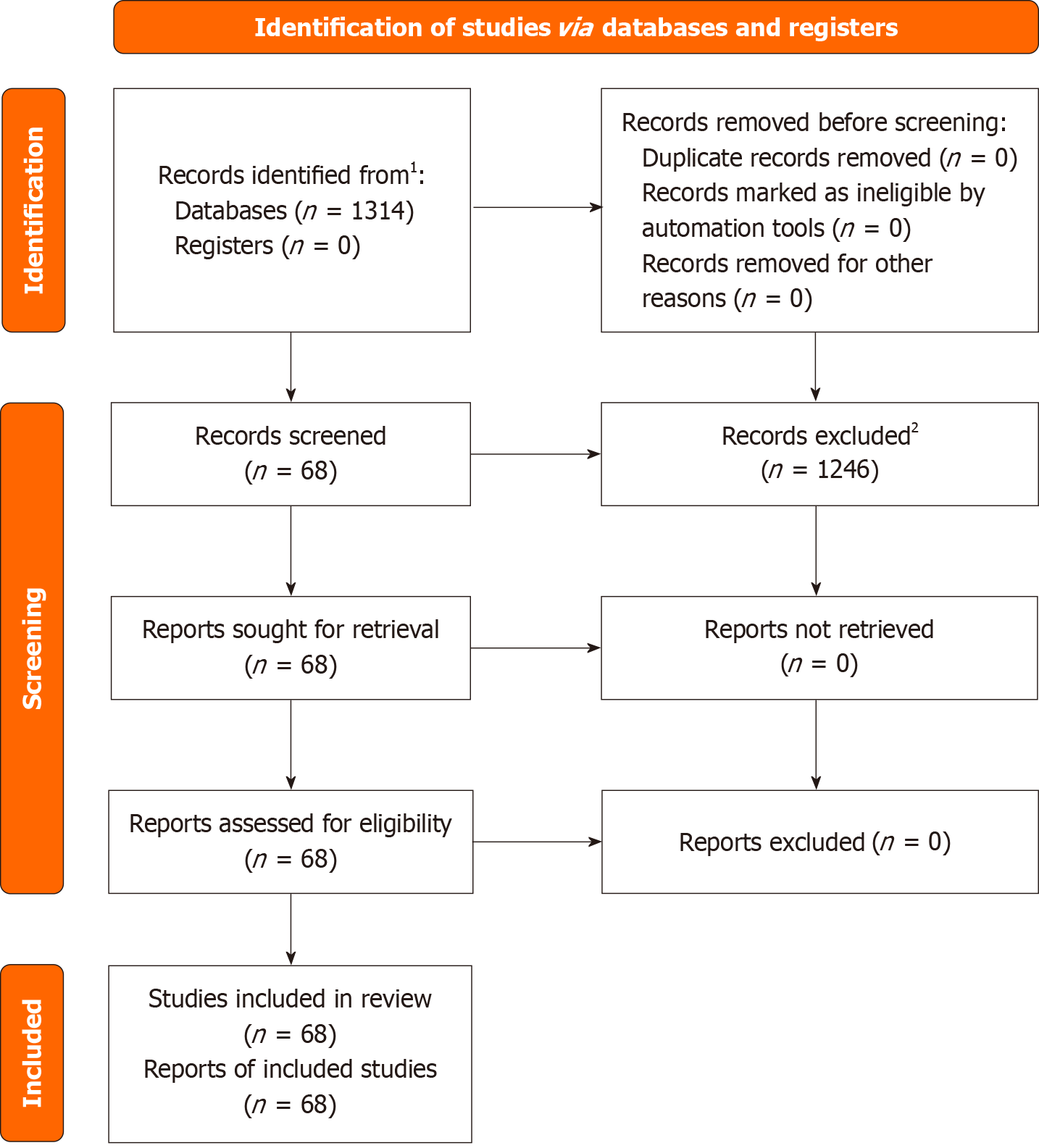 Included records were those that were published in English, on adult populations (> 18 years old), and were relevant to our systematic review. 1Consider, if feasible to do so, reporting the number of records identified from each database or register searched (rather than the total number across all databases/registers); 2If automation tools were used, indicate how many records were excluded by a human and how many were excluded by automation tools.