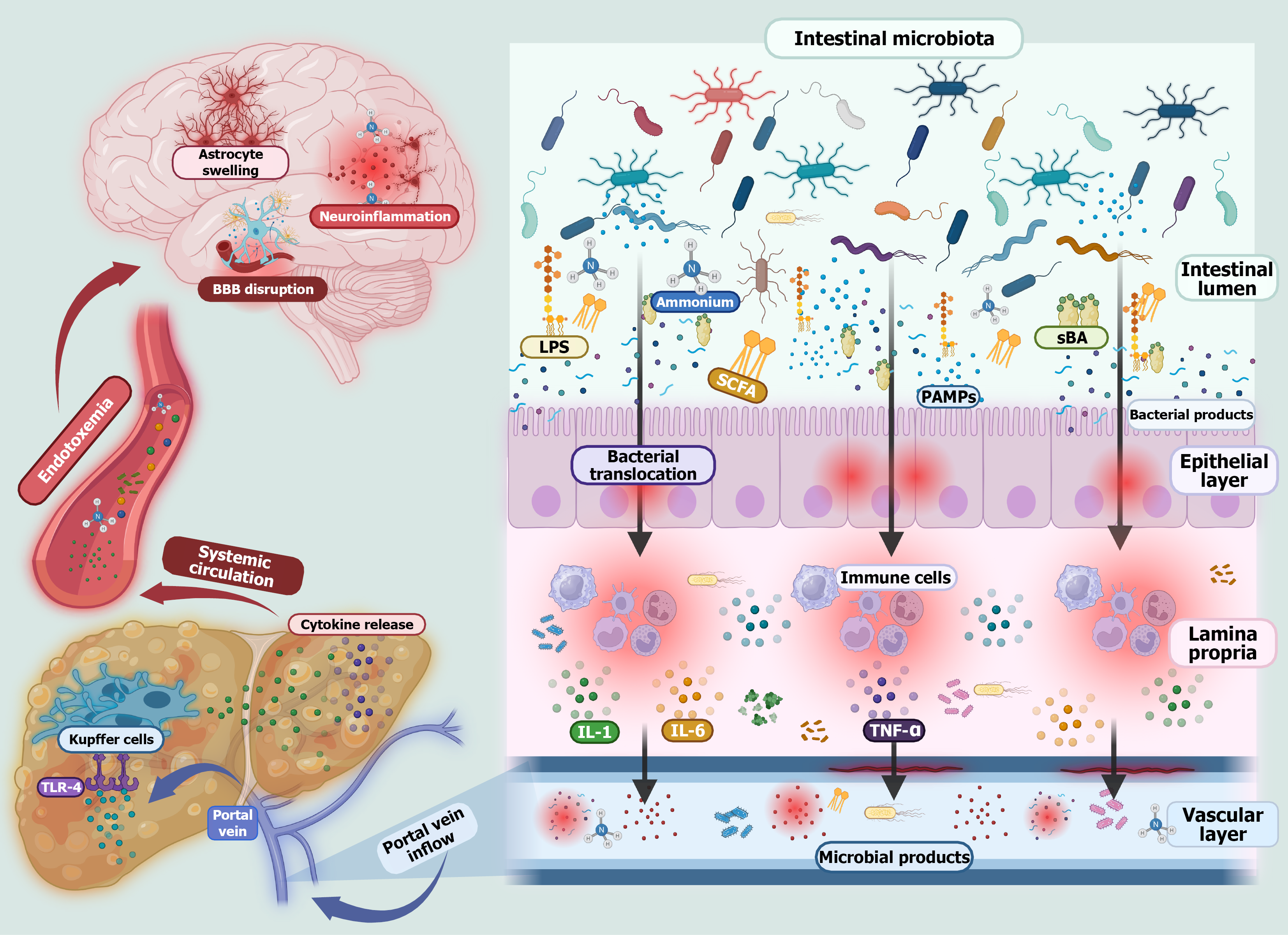 During chronic liver disease gut dysbiosis and disruption of the intestinal barrier lead to bacterial overgrowth and a reduction in beneficial commensal organisms. This imbalance results in the release of pathogen-associated molecular patterns such as lipopolysaccharide, flagellin, and peptidoglycan. These molecules along with bacteria translocate across the compromised intestinal barrier, triggering immune cell activation and the production of proinflammatory cytokines. These cytokines travel through the portal vein to the liver. In the context of liver dysfunction, toxins like ammonia are not properly metabolized and can reach the brain, contributing to blood-brain barrier disruption. The combination of systemic inflammation and elevated ammonia levels leads to astrocyte swelling, a hallmark of hepatic encephalopathy. Astrocyte swelling results from ammonia-induced glutamine accumulation within these brain cells, leading to osmotic imbalance and cerebral edema, which contribute to neuroinflammation and the cognitive impairments characteristic of hepatic encephalopathy. PAMPs: Pathogen-associated molecular patterns; sBA: Secondary bile acids; SCFA: Short-chain fatty acids; LPS: Lipopolysaccharide; IL: Interleukin; TNF-α: Tumor necrosis factor-alpha; TLR-4: Toll-like receptor 4.