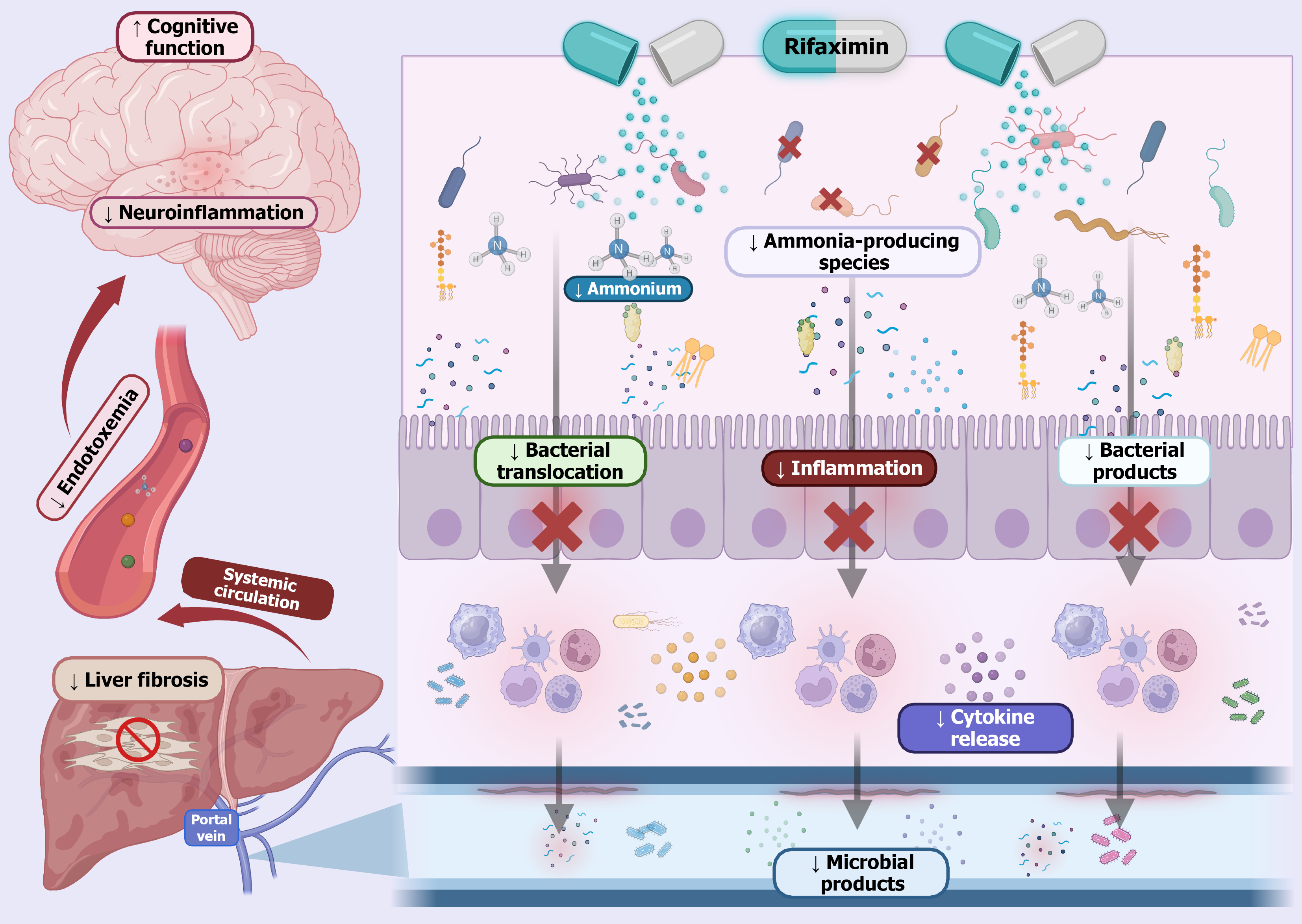 Rifaximin is a non-absorbable antibiotic that acts locally in the gut to modulate the intestinal microbiota. In patients with hepatic encephalopathy, this antibiotic reduces the abundance of ammonia-producing bacteria, leading to decreased production of ammonia and other gut-derived toxins. This reduction helps limit bacterial translocation and the associated release of proinflammatory cytokines. As a result fewer microbial products enter the portal circulation, contributing to decreased hepatic inflammation and potentially slowing the progression of liver fibrosis. Additionally, by lowering systemic levels of neurotoxic substances, rifaximin helps reduce neuroinflammation and improves cognitive function in patients with hepatic encephalopathy.