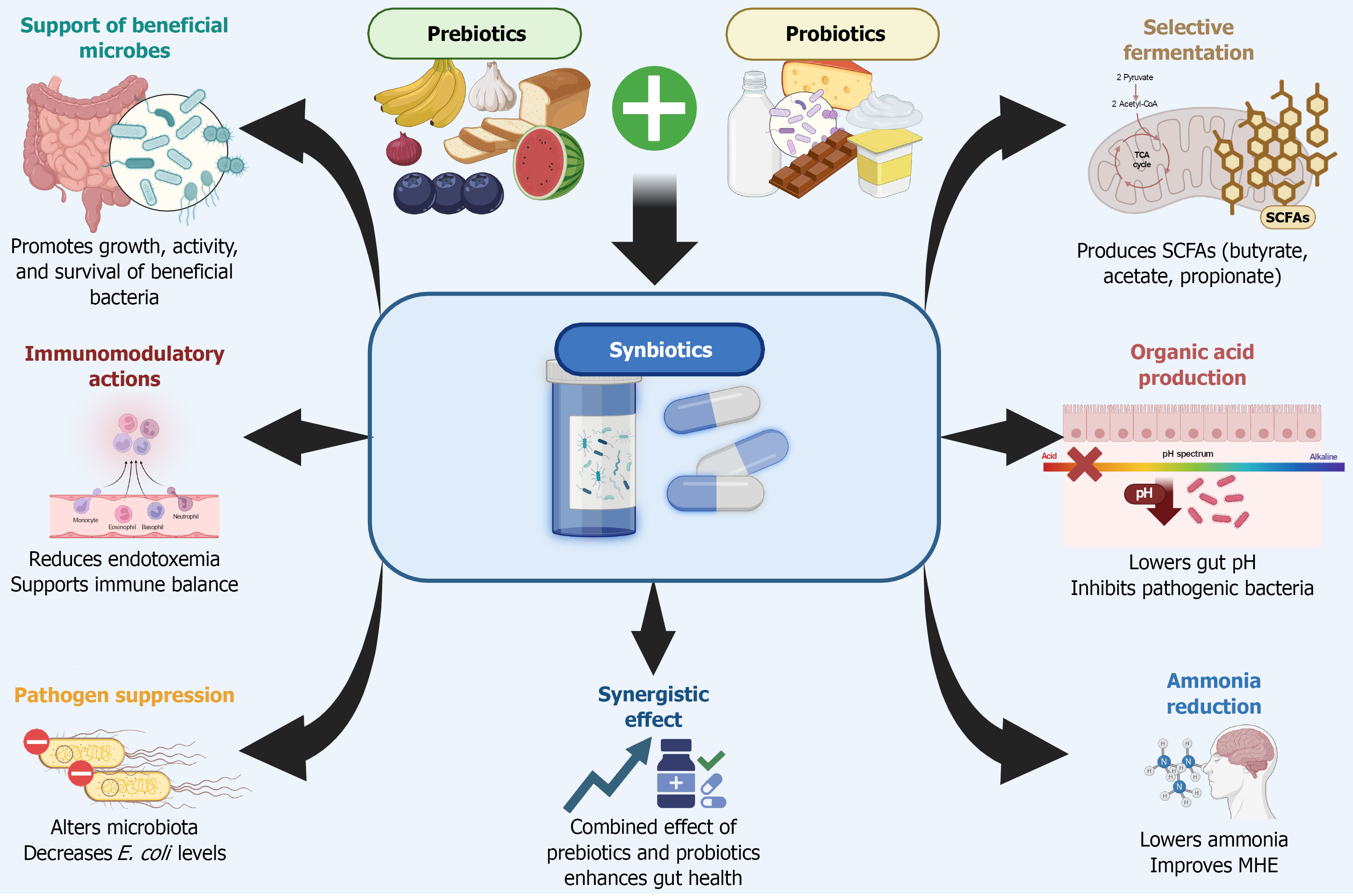 This illustration highlights the key mechanisms through which synbiotic therapy, combining prebiotics and probiotics, exerts beneficial effects on gut microbiota and host metabolism. Synbiotics work synergistically to promote the growth and activity of beneficial bacteria, enhance short-chain fatty acids production through selective fermentation, and lower intestinal pH via organic acid release. These changes suppress pathogenic organisms, reduce systemic endotoxemia, and modulate immune responses. Additionally, synbiotics help decrease intestinal ammonia production and absorption, contributing to improved cognitive outcomes in patients with hepatic encephalopathy. SCFA: Short-chain fatty acids; MHE: Minimal hepatic encephalopathy; E. coli: Escherichia coli.