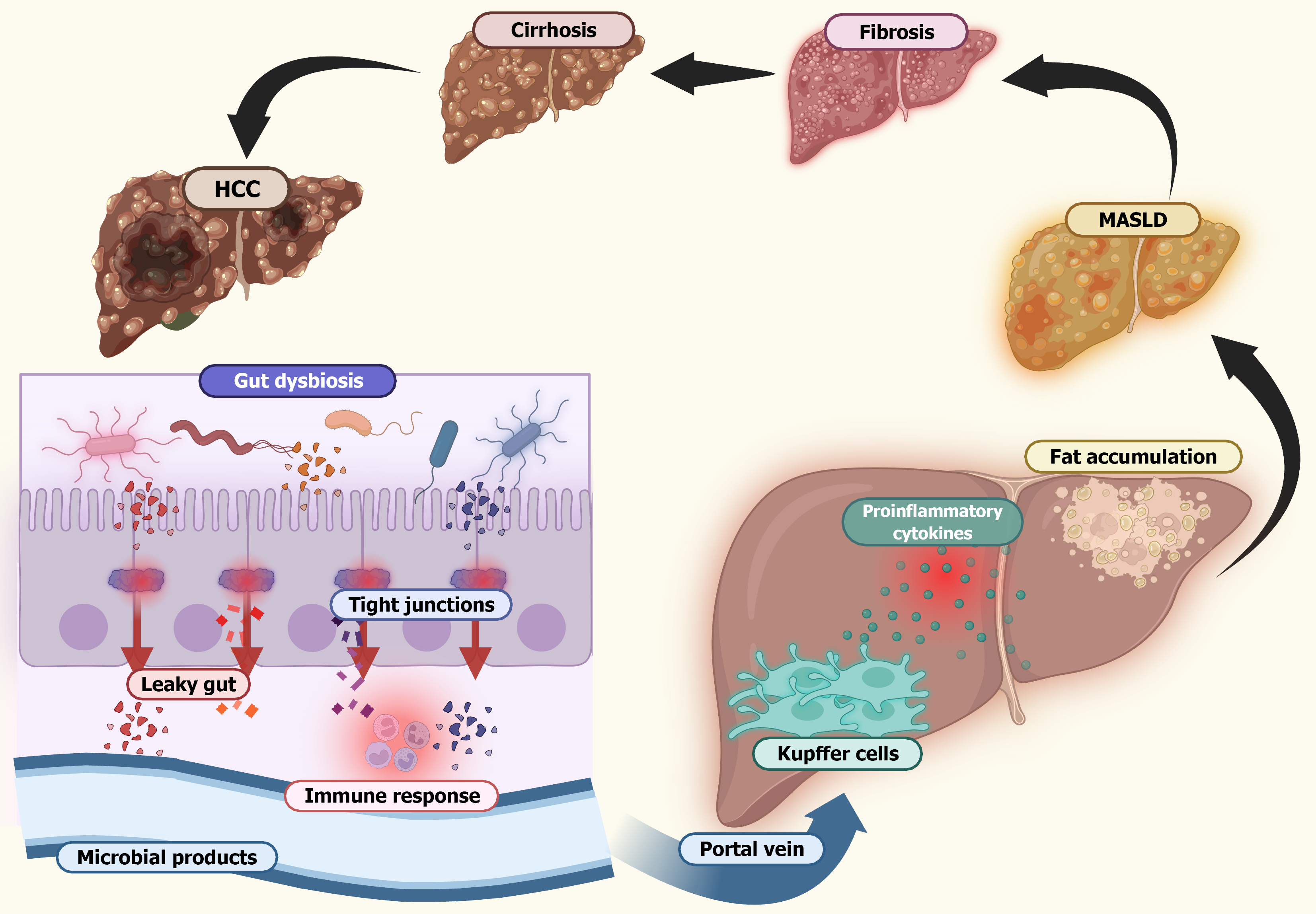 This illustration describes the sequence of events linking gut dysbiosis to progressive liver damage. Disruption of the gut microbiota leads to mucus layer depletion and loss of intestinal barrier integrity, resulting in a leaky gut. This facilitates microbial translocation and increases the production of microbial metabolites such as endotoxins. These microbial products enter the portal circulation and reach the liver where they activate Kupffer cells and stimulate the release of proinflammatory cytokines. The resulting chronic inflammation promotes hepatic fat accumulation and initiates fibrotic processes. Over time this inflammatory cascade drives the progression from metabolic dysfunction-associated steatotic liver disease to more severe forms of liver injury, including fibrosis, cirrhosis, and ultimately hepatocellular carcinoma. MASLD: Metabolic dysfunction-associated steatotic liver disease; HCC: Hepatocellular carcinoma.