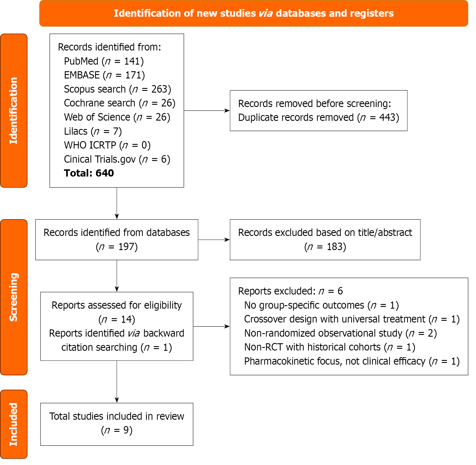 The search strategy in PubMed, EMBASE, Scopus, Cochrane, Web of Science, Lilacs, World Health Organization ICRTP, and Clinical Trials.gov yielded 640 studies, of which 15 were fully reviewed for inclusion and exclusion criteria. Nine studies were included in the meta-analysis.