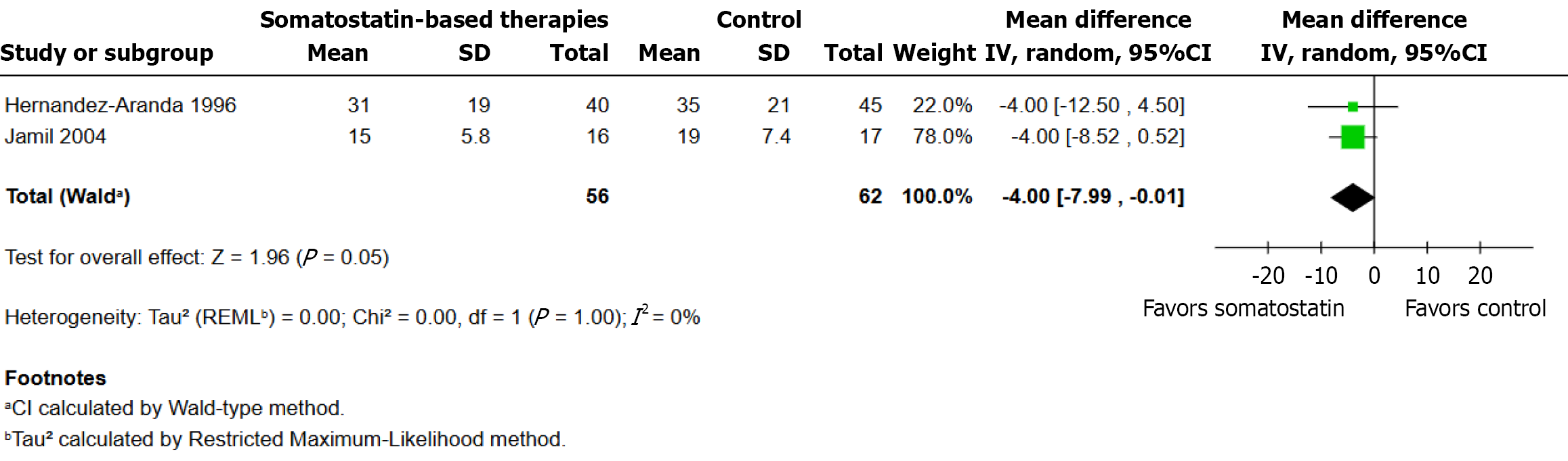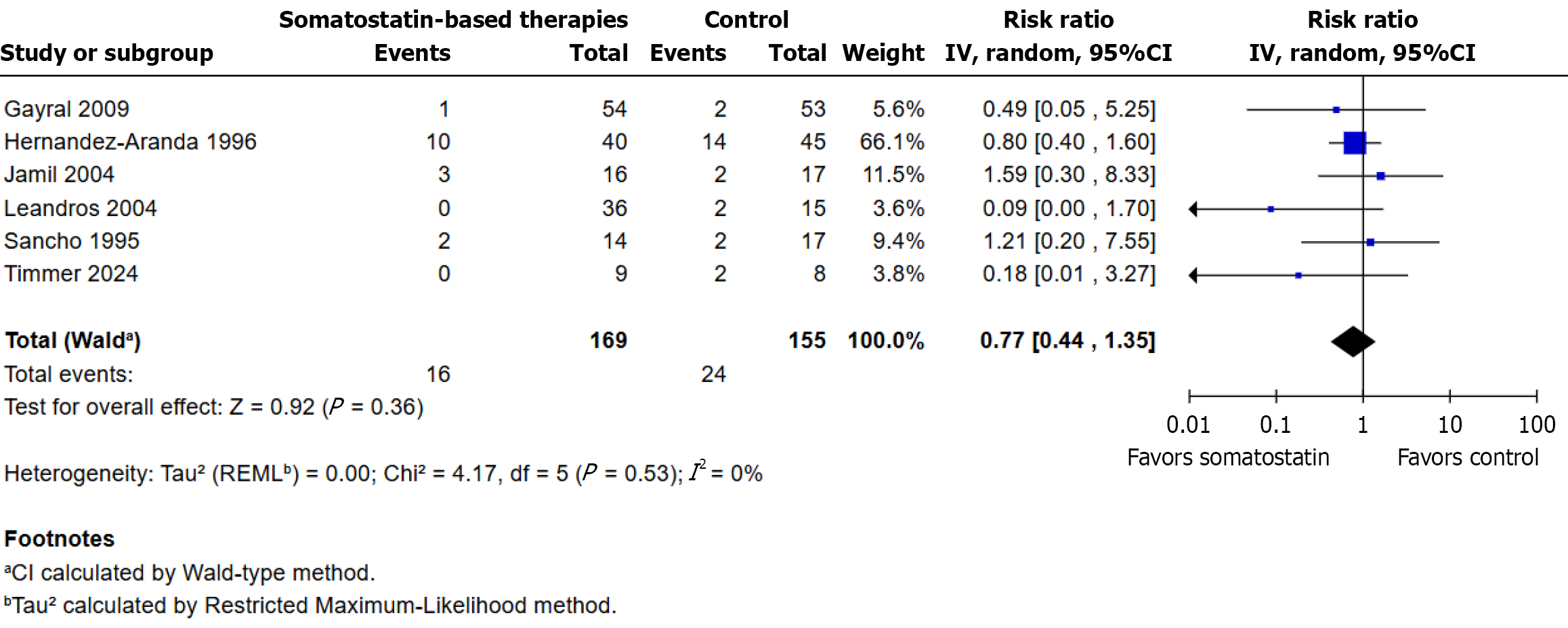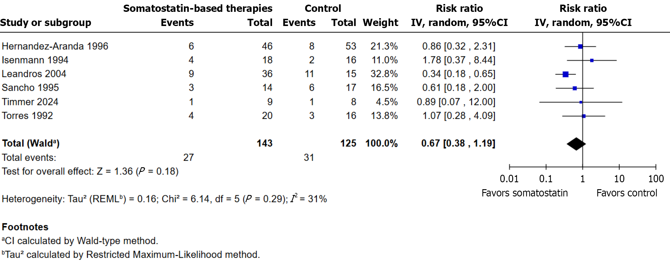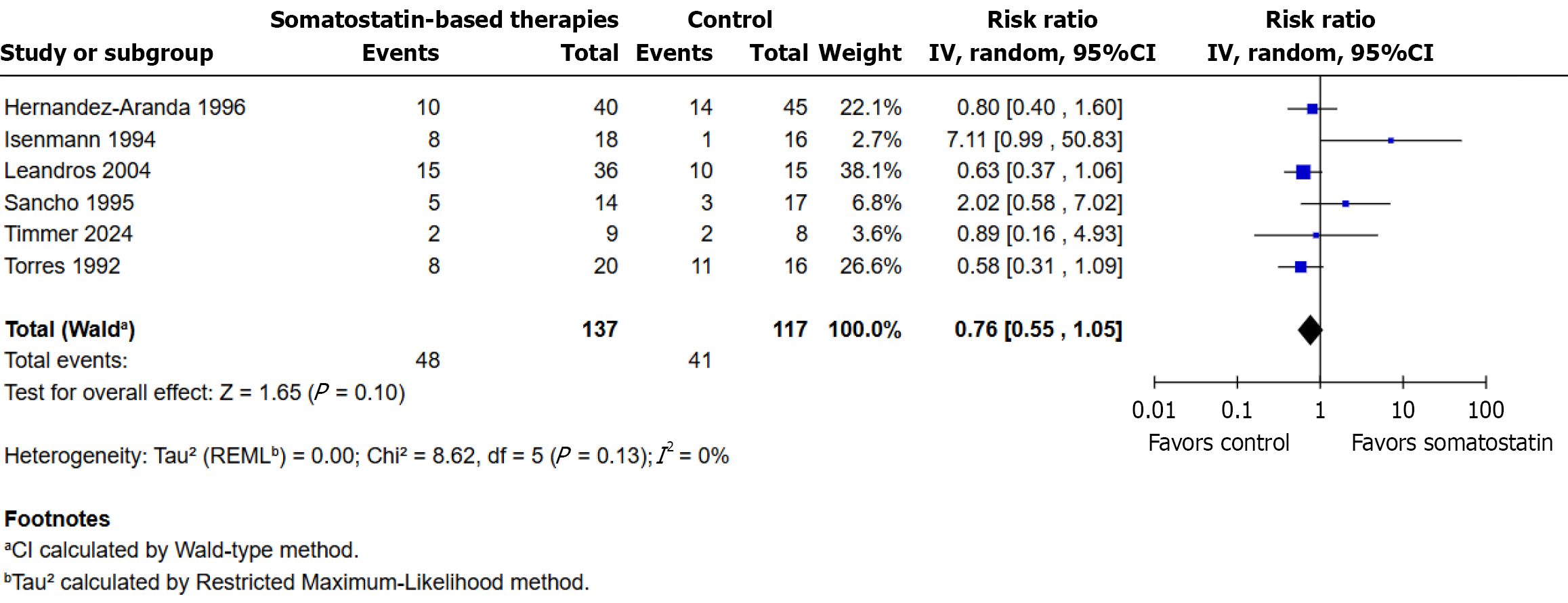 - Citation: Ribeiro Junior MAF, Fontenelle Vieira L, Thalib HI, Fouzaan Albeez S, Heba Fakruddin F, Mirza Zafar Baig A, Mohammed H, Nafeesa Hashim S, Rauf Khan AA, Dib Possiedi R. Somatostatin-based therapies for external gastrointestinal fistulas: Updated meta-analysis of randomized clinical trials. World J Gastrointest Pharmacol Ther 2025; 16(4): 111889