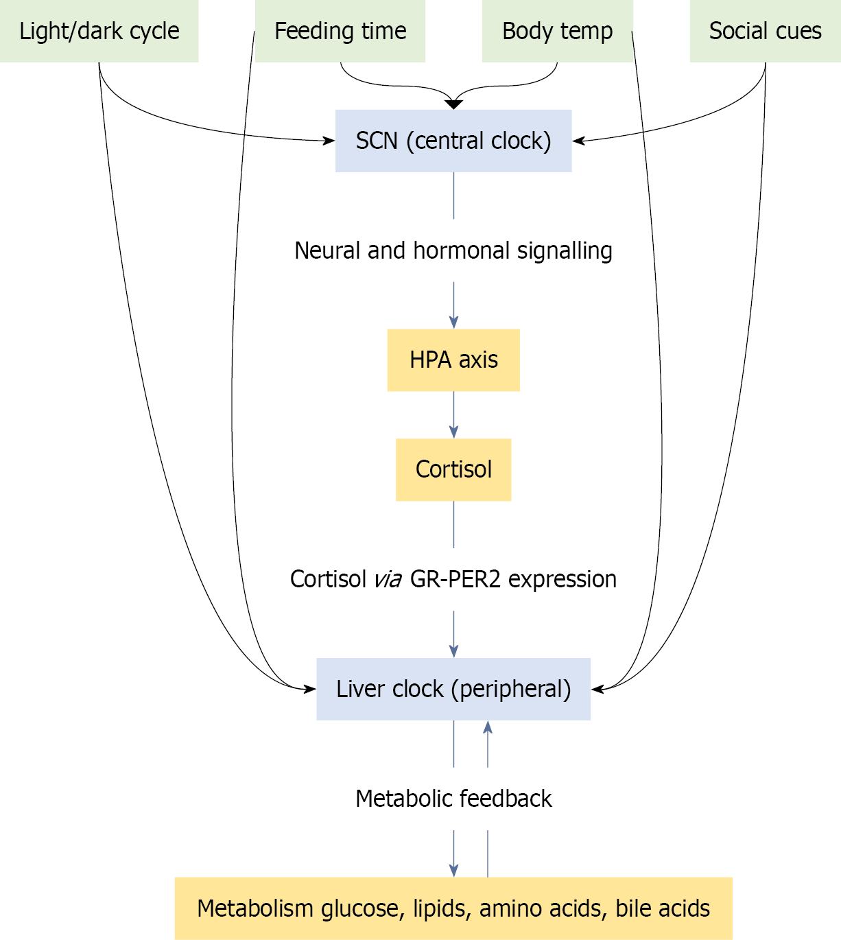 Figure 1 Interaction of liver clock with central clock and entraining factors.