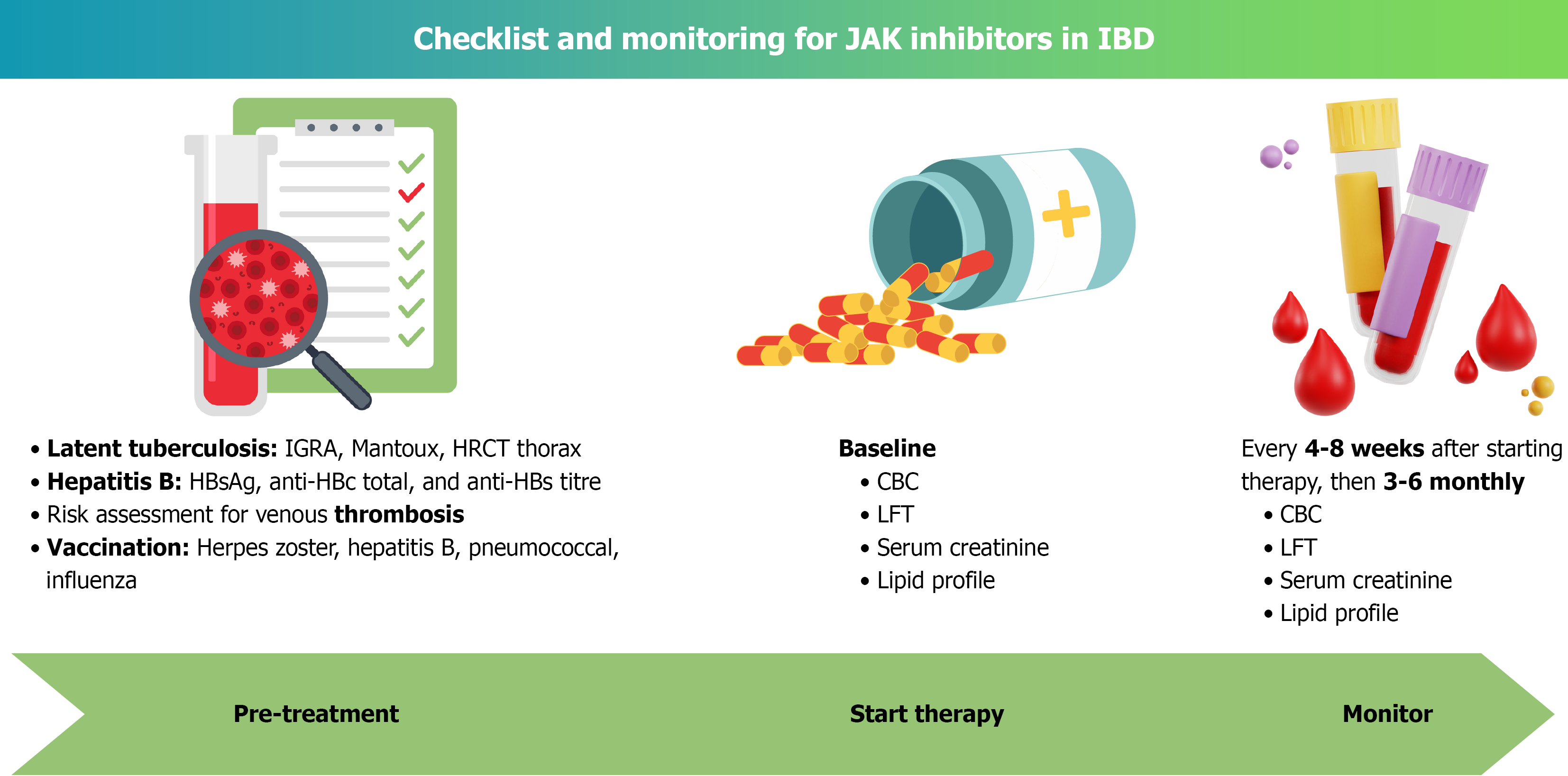 JAK: Janus kinase; IBD: Inflammatory bowel disease; IGRA: Interferon gamma release assay; HRCT: High-resolution computed tomography; HBsAg: Hepatitis B surface antigen; anti-HBc: Hepatitis B core antibody; anti-HBs: Hepatitis B surface antibody; CBC: Complete blood count; LFT: Liver function test.