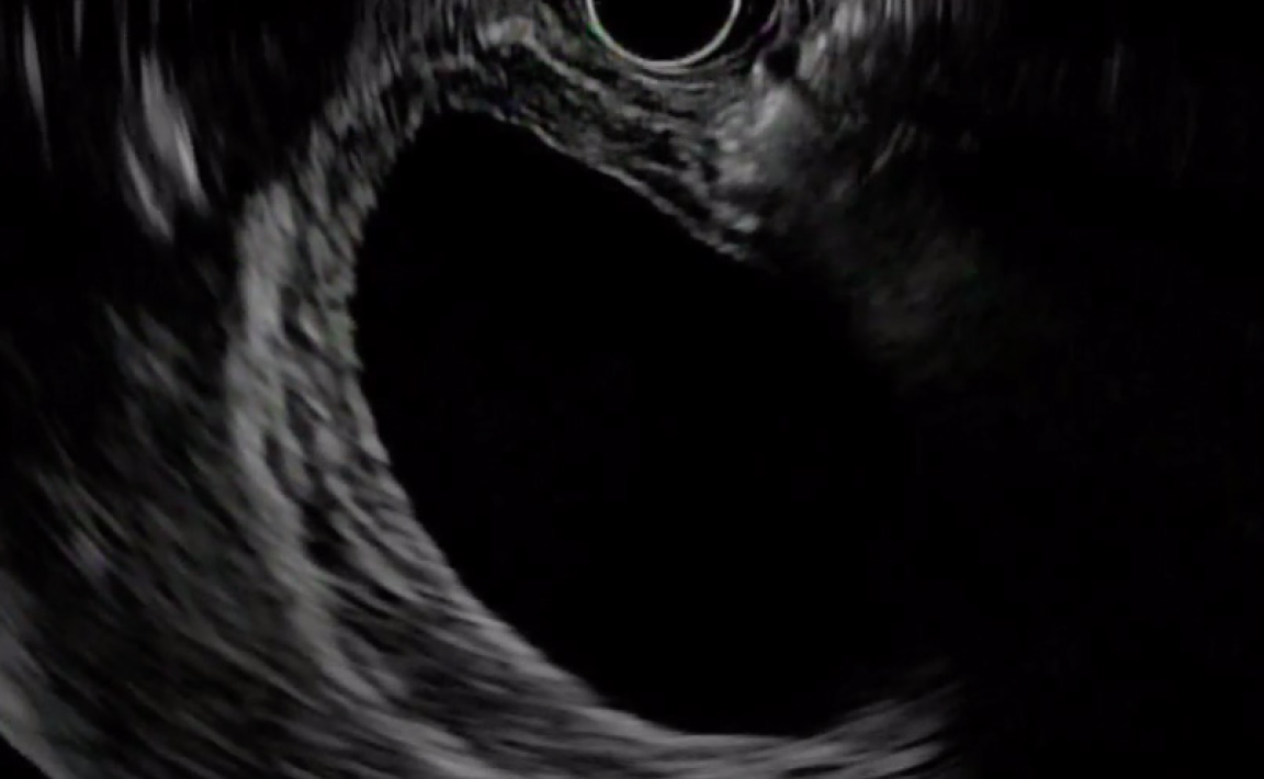 Endoscopic ultrasound transduodenal view of dilated gall bladder lumen with thickened wall.