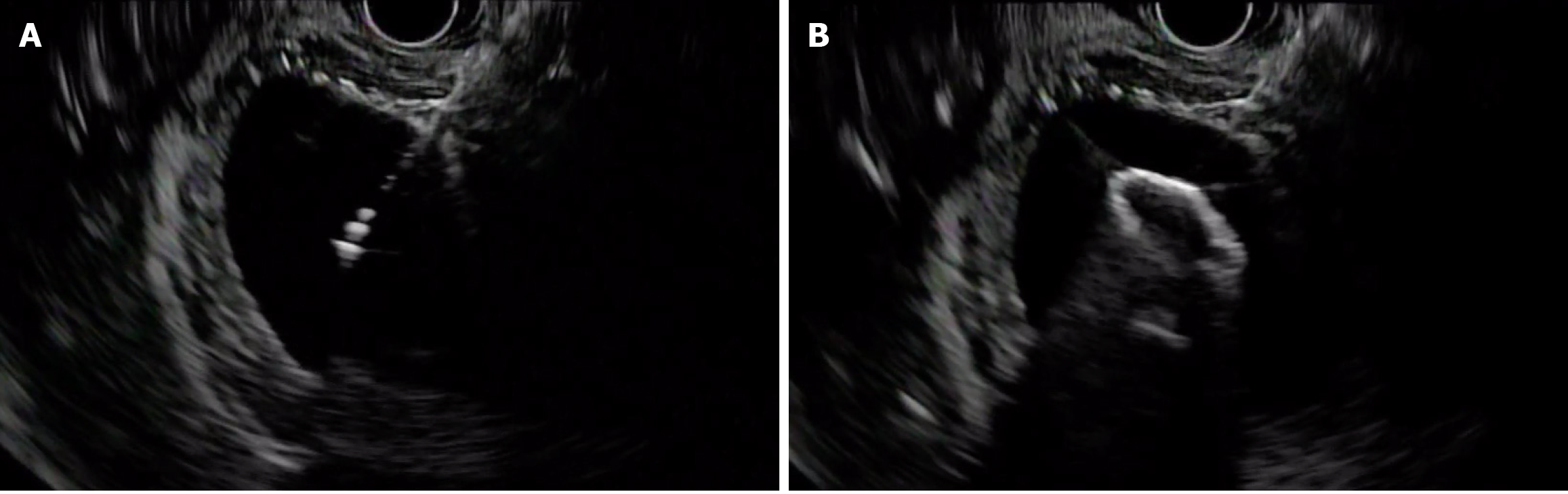 A: View of gallbladder demonstrating electrocautery tip of lumen apposing metal-stents deployment device within gallbladder lumen; B: View of gallbladder demonstrating distal flange of lumen apposing metal-stents deployed in gallbladder lumen.