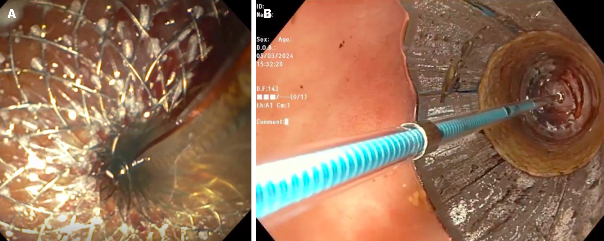 A: View of proximal flange of lumen apposing metal-stents deployed in duodenum with subsequent bile flow through stent; B: View of controlled radial expansion balloon dilatation of lumen apposing metal-stents to facilitate access to gallbladder lumen.