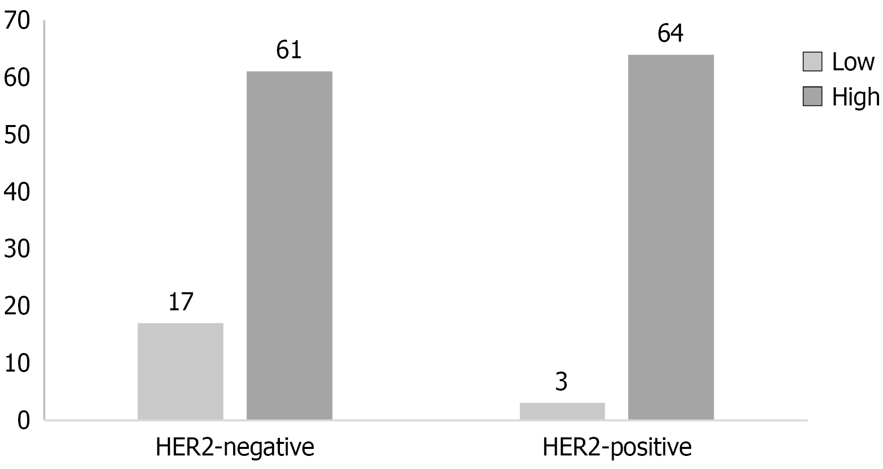 Figure 1 A bar graph of the correlation between human epidermal growth factor receptor 2 expression and tumor grade in upper tract urothelial carcinoma patients.