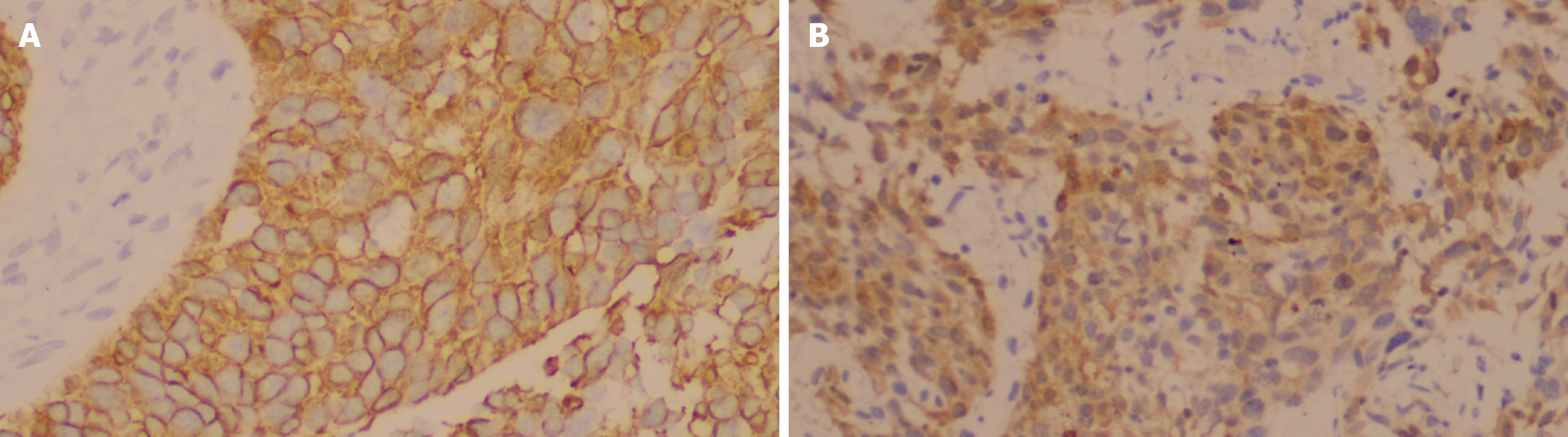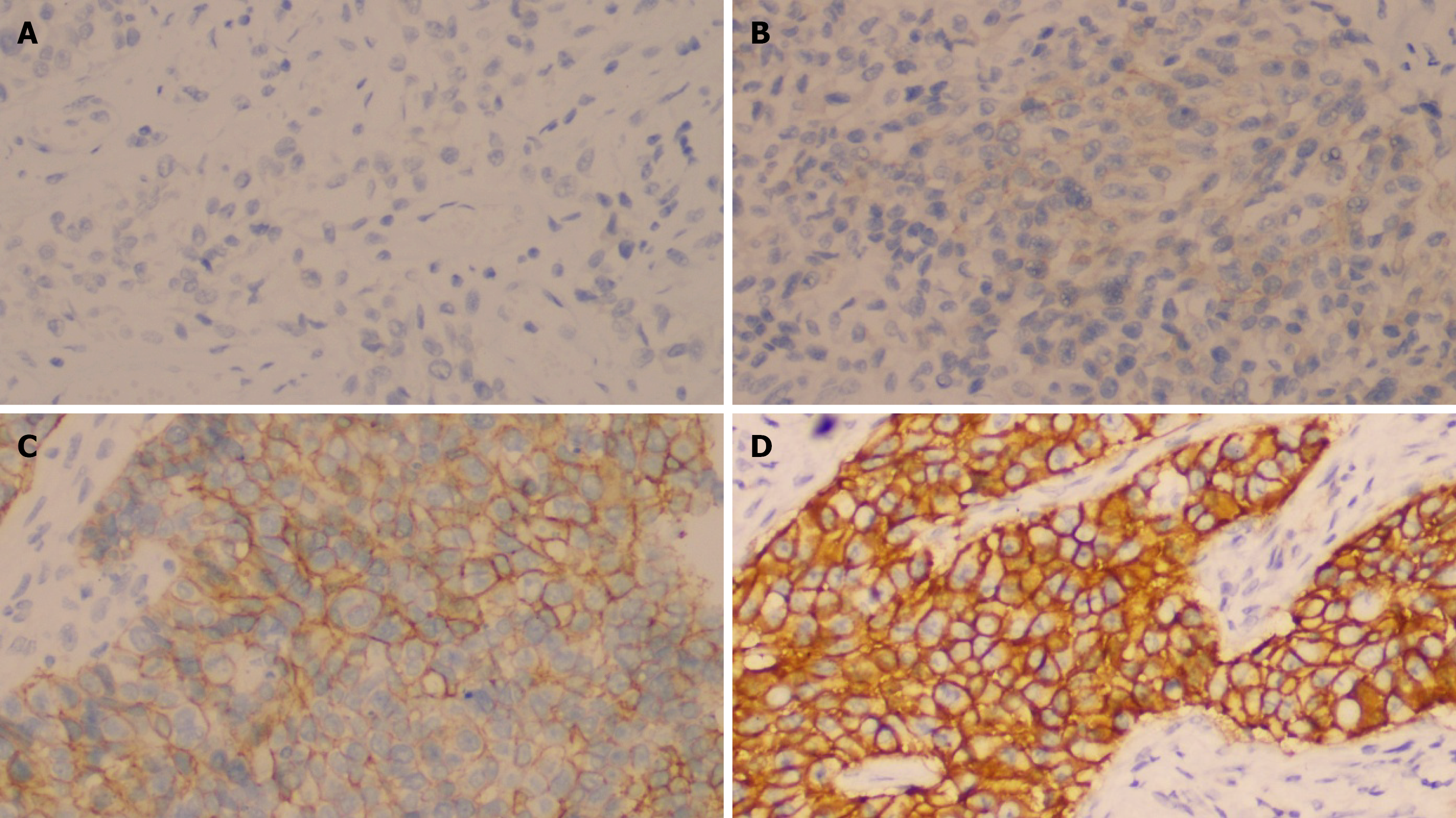 A: No staining observed or < 10% of invasive tumor cells showed incomplete and faint membrane staining were scored 0; B: ≥ 10% of invasive tumor cells demonstrated incomplete and faint membrane staining were scored 1+; C: Either ≥ 10% of invasive tumor cells showed weak-to-moderate intensity complete circumferential membrane staining or < 10% of invasive tumor cells exhibited complete circumferential membrane staining were scored 2+; D: ≥ 10% of invasive tumor cells showed strong intensity complete circumferential membrane staining were scored 3+; Original magnification, × 200.
