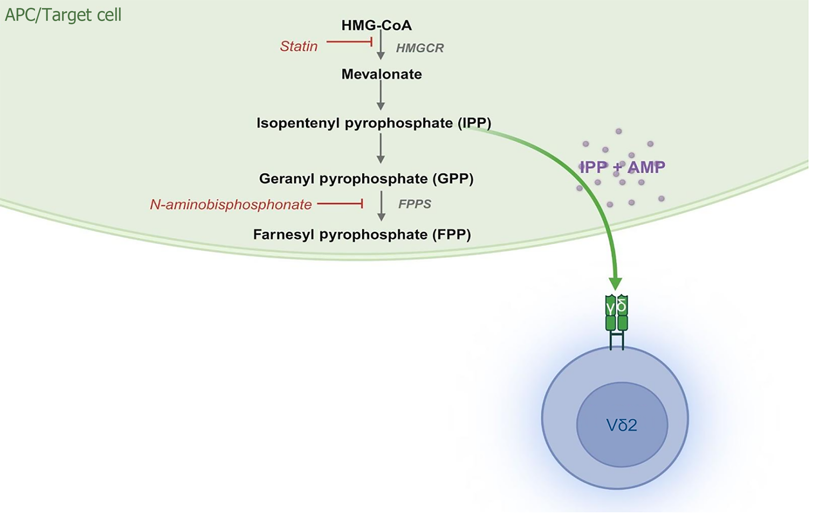 N-aminobisphosphonates, including zoledronate, inhibit the mevalonate pathway by blocking farnesyl pyrophosphate synthase. This results in intracellular accumulation of isopentenyl pyrophosphate and its metabolites, which are recognized by Vδ2 T cells. APC: Antigen-presenting cell; FFPS: Farnesyl pyrophosphate synthase; HMG-CoA: 3-hydroxy-3-methyl-glutaryl-coenzyme A; HMGCR: 3-hydroxy-3-methyl-glutaryl-coenzyme A reductase; IPP: Isopentenyl pyrophosphate.