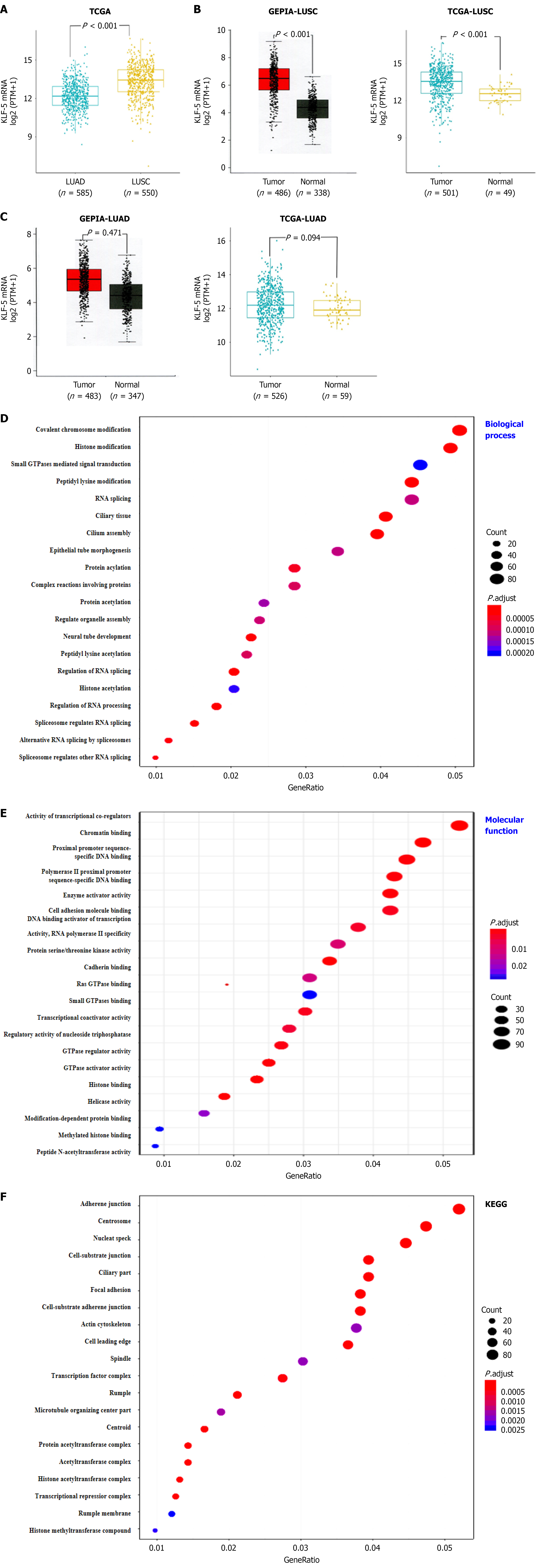 A: KLF5 mRNA in lung adenocarcinoma (LUAD) (n = 585) or lung squamous-cell carcinoma (LUSC) (n = 550) tissues from the Cancer Genome Atlas (TCGA). database; B: KLF5 mRNA in LUSC or normal tissues from the Gene Expression Profiling Interactive Analysis (GEPIA) (Left) or TCGA (Right) databases; C: KLF5 mRNA in LUAD or normal tissues from the GEPIA (Left) or TCGA (Right) databases; D: Biological process of KLF5; E: Molecular function of KLF5; F: KEGG analysis of KLF5. KLF5: Krüppel-like factor 5 LUAD: Lung adenocarcinoma; LUSC: Lung squamous-cell carcinoma.