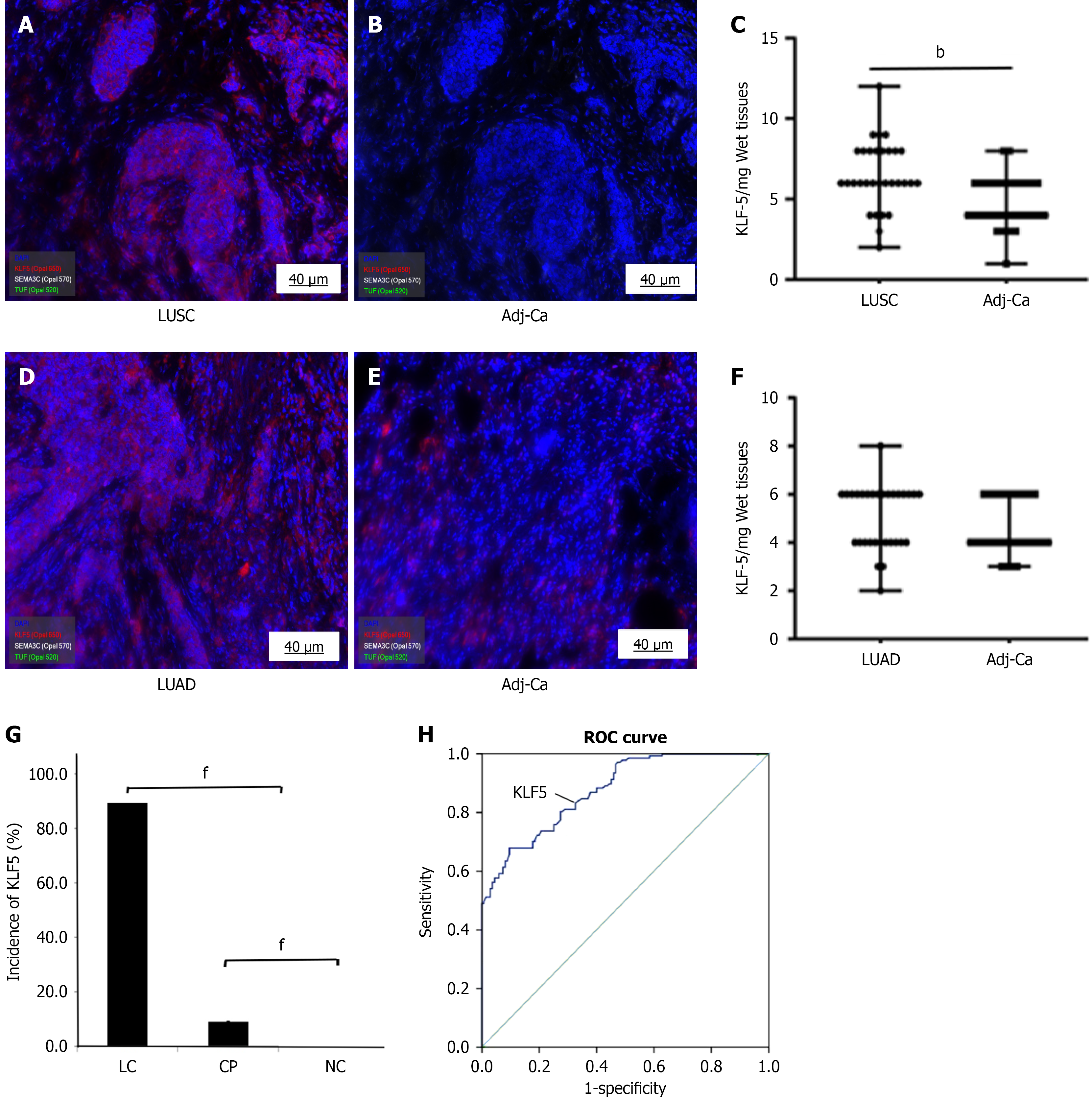 A-C: Krüppel-like factor-5 (KLF5) in lung squamous-cell carcinoma (LUSC): B: KLF5 in Adj-Ca tissues of LUSC; C: KLF5 ng/mg wet lung tissues (n = 60), bP < 0.01; D-F: KLF5 in lung adenocarcinoma (LUAD): E: KLF5 in Adj-Ca tissues of LUAD; F: KLF5 ng/mg wet lung tissues (n = 60); G: The positive rates of serum KLF5 (> 800 ng/mL) in LUSC, chronic pneumonia and normal control, fP < 0.01; H: Receiver operating characteristic curve of circulating KLF5 Levels for LUSC diagnosis. Adj-Ca: Adjacent cancerous tissues; GAPDH: Glyceraldehyde-3-phosphate dehydrogenase; KLF5: Krüppel-like factor 5; LUAD: Lung adenocarcinoma; LUSC: Lung squamous-cell carcinoma; MIF: Multiplex immunofluorescence; LC: Lung cancer; CP: Chronic pneumonia; NC: Normal control; ROC: Receiver operating characteristic.