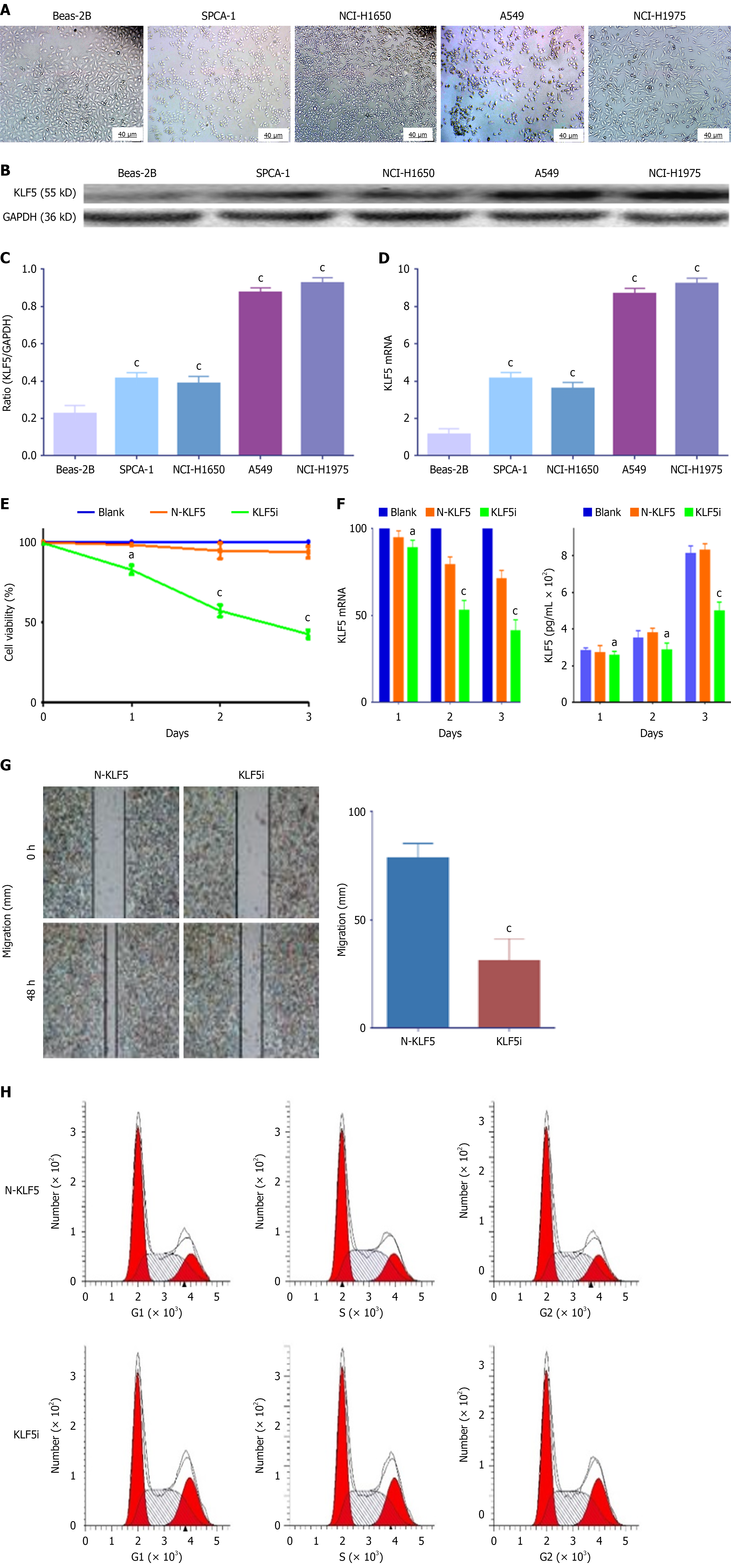 A: Lung Beas-2B cells and lung cancer SPC-A-1, NCI-1650, A549 and NCI-1975 cells; B: Krüppel-like factor 5 (KLF5) at the protein level in different cells, as determined by Western blotting; C: Ratios of KLF5 to glyceraldehyde-3-phosphate dehydrogenase; D: KLF5 at the mRNA level in different cells, as determined by quantitative real-time PCR (qRT-PCR); E: Proliferating curve of A549 cells divided into blank, N-KLF5 or KLF5 intervention (KLF5i) groups and transfected with KLF5i plasmids; F: Alterations in KLF5 mRNA by qRT-PCR; G: Migrating analysis of A549 cells among different groups; H: Cell cycle alterations. GAPDH: Glyceraldehyde-3- phosphate dehydrogenase. aP < 0.05 and cP < 0.001, compared with the blank or N-KLF5 group. KLF5: Krüppel-like factor 5.