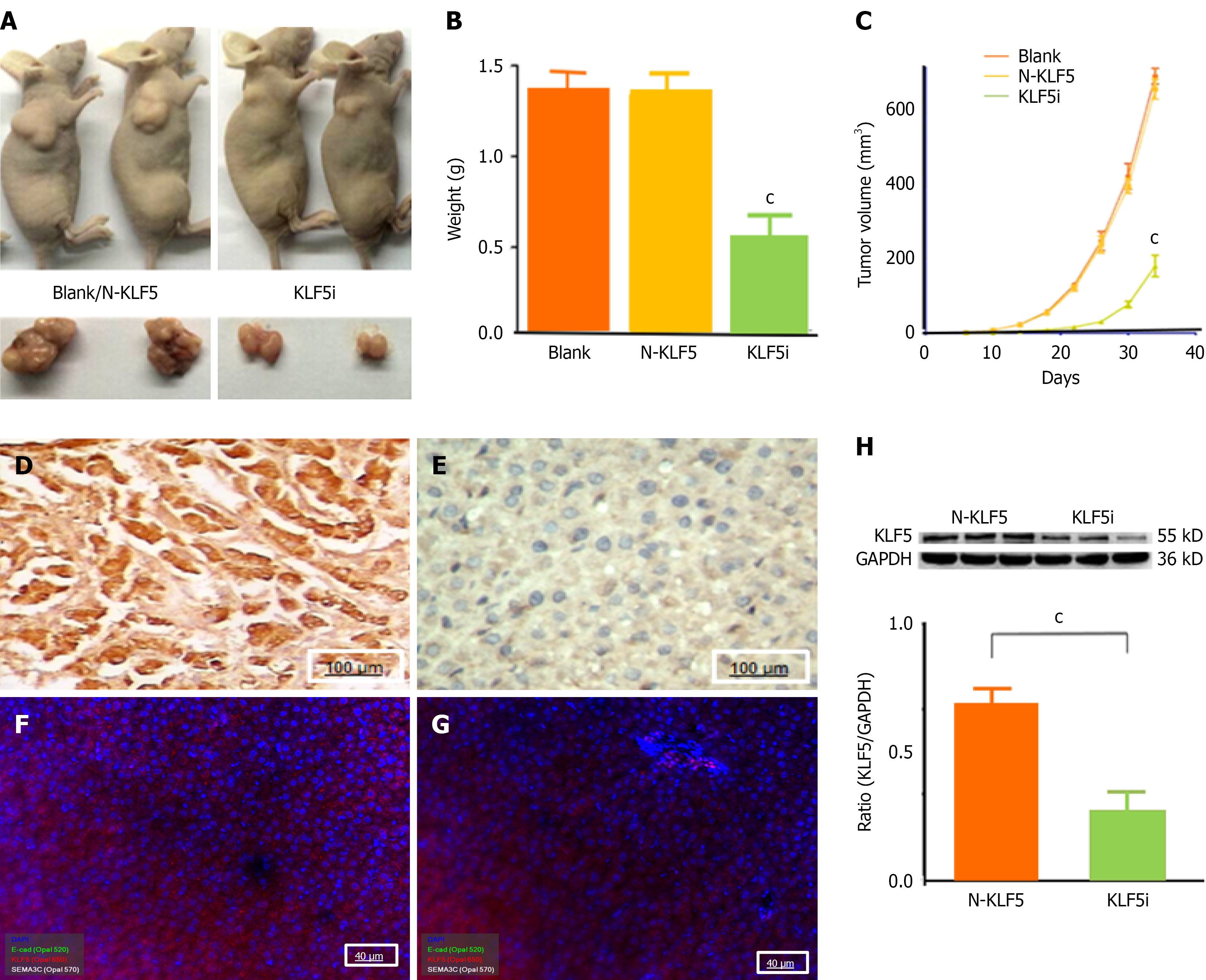 A: Nude mouse xenograft tumor growth after subcutaneous injection of A549 cells transfected with or without Krüppel-like factor 5 intervention (KLF5i) plasmids; B: Xenograft tumor weight (g); C: Xenograft tumor volume; D: Krüppel-like factor 5 (KLF5) straining by IHC in the N-KLF5 group (n = 6); E: KLF5 straining by IHC in the KLF5i group (n = 6); F: KLF5 straining by MIF in the N-KLF5 group; G: KLF5 straining by MIF in the KLF5i group; H: KLF5 in xenograft tumors by Western blotting (top) and their ratios from KLF5i to GAPDH (bottom). cP < 0.001, compared with the blank or N-KLF5 group. GAPDH: Glyceraldehyde-3-phosphate dehydrogenase; IHC: Immunohisto- chemistry; KLF5: Krüppel-like factor 5; MIF: Multiplex immunofluorescence.