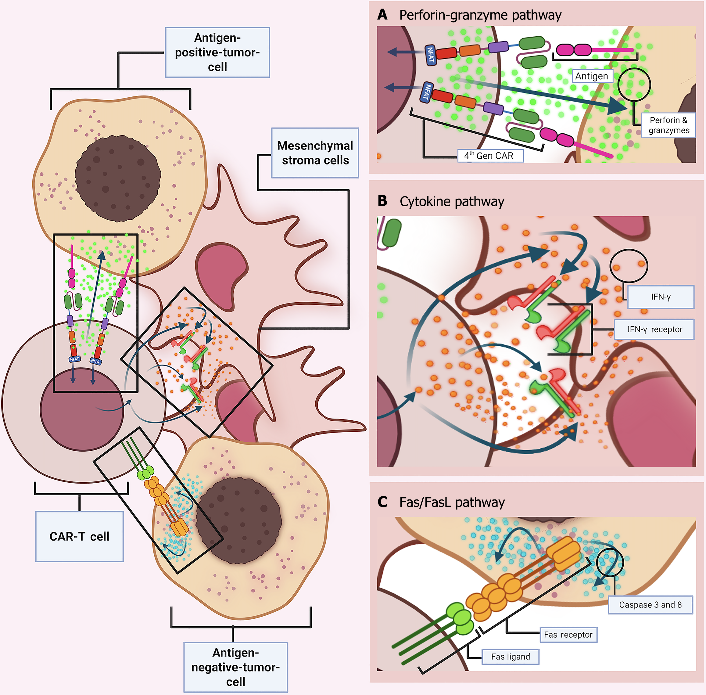 A: Perforin-granzyme degranulation pathway: Chimeric antigen receptor (CAR) T cells recognize antigen-positive tumor cells through CAR-tumor-associated antigen binding, resulting in perforin and granzyme release driven targeted cell death; B: Cytokine-Mediated Pathway: Cytokine (e.g., interferon-gamma) secretion (here, due to the secondary cytokine transgene expression after nuclear factor of activated T cells-included CAR activation) sensitizes the stromal cells in the tumor microenvironment (TME). It upregulates complementary receptor expression and proper stromal targeting through ligand-receptor engagement; C: Death receptor-ligand [Fas/Fas ligand (FasL) Pathway: Antigen loss of tumor cells inside TME can be targeted using the death receptor-ligand engagement, through the formation of the FasL-receptor complex. CAR: Chimeric antigen receptor; IFN-γ: Interferon-gamma; NFAT: Nuclear factor of activated T cells; FasL: Fas ligand.