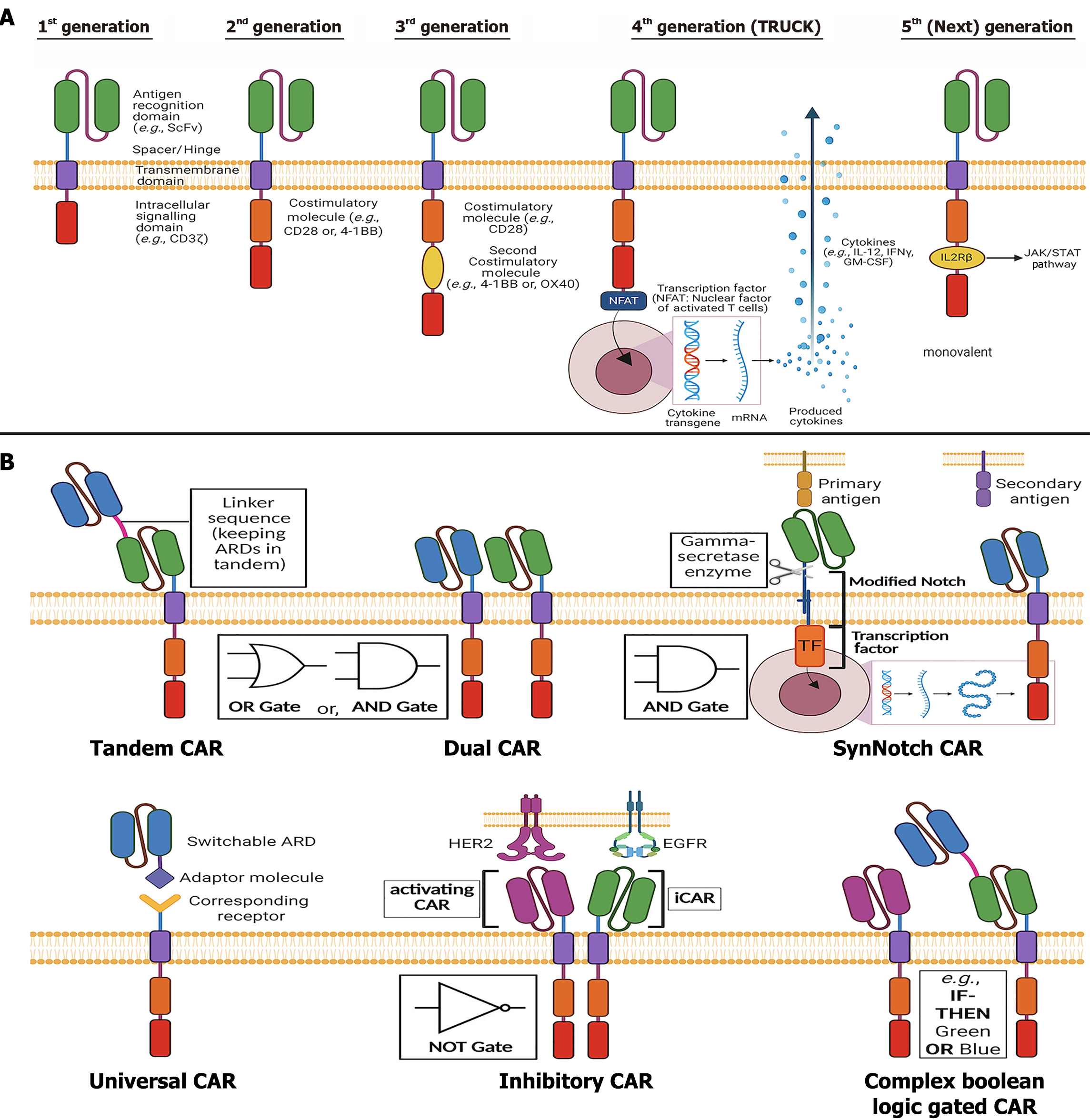 A: Overview of the five generations of chimeric antigen receptor (CAR) structure; B: Prominent examples of some of the advanced CAR design approaches. ScFv: Single chain variable fragment; IFN-γ: Interferon-gamma; ARD: Antigen recognition domain; CAR: Chimeric antigen receptor.