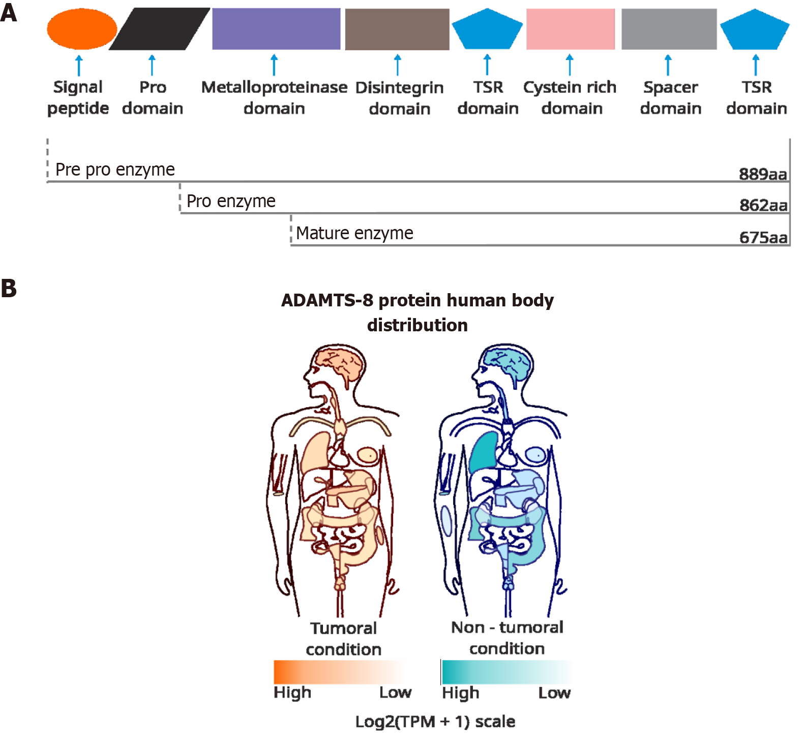 The blue color represents healthy conditions, and the orange color represents tumor conditions. A higher intensity of color correlated with a higher expression of ADAM metallopeptidase with thrombospondin type 1 motif 8 (ADAMTS-8) in the indicated organ. A: Protein structure of ADAMTS-8; B: Schema modified of GEPIA web server based on expression of ADAMTS-8 in the human body. Citation: Tang Z, Li C, Kang B, Gao G, Li C, Zhang Z. GEPIA: A web server for cancer and normal gene expression profiling and interactive analyses. Nucleic Acids Res 2017; 45: W98-W102. Copyright ©The Authors 2025. Published by Oxford University Press. (https://academic.oup.com/pages/open-research/open-access). ADAMTS-8: ADAM metallopeptidase with thrombospondin type 1 motif 8; TPM: Transcripts per million.