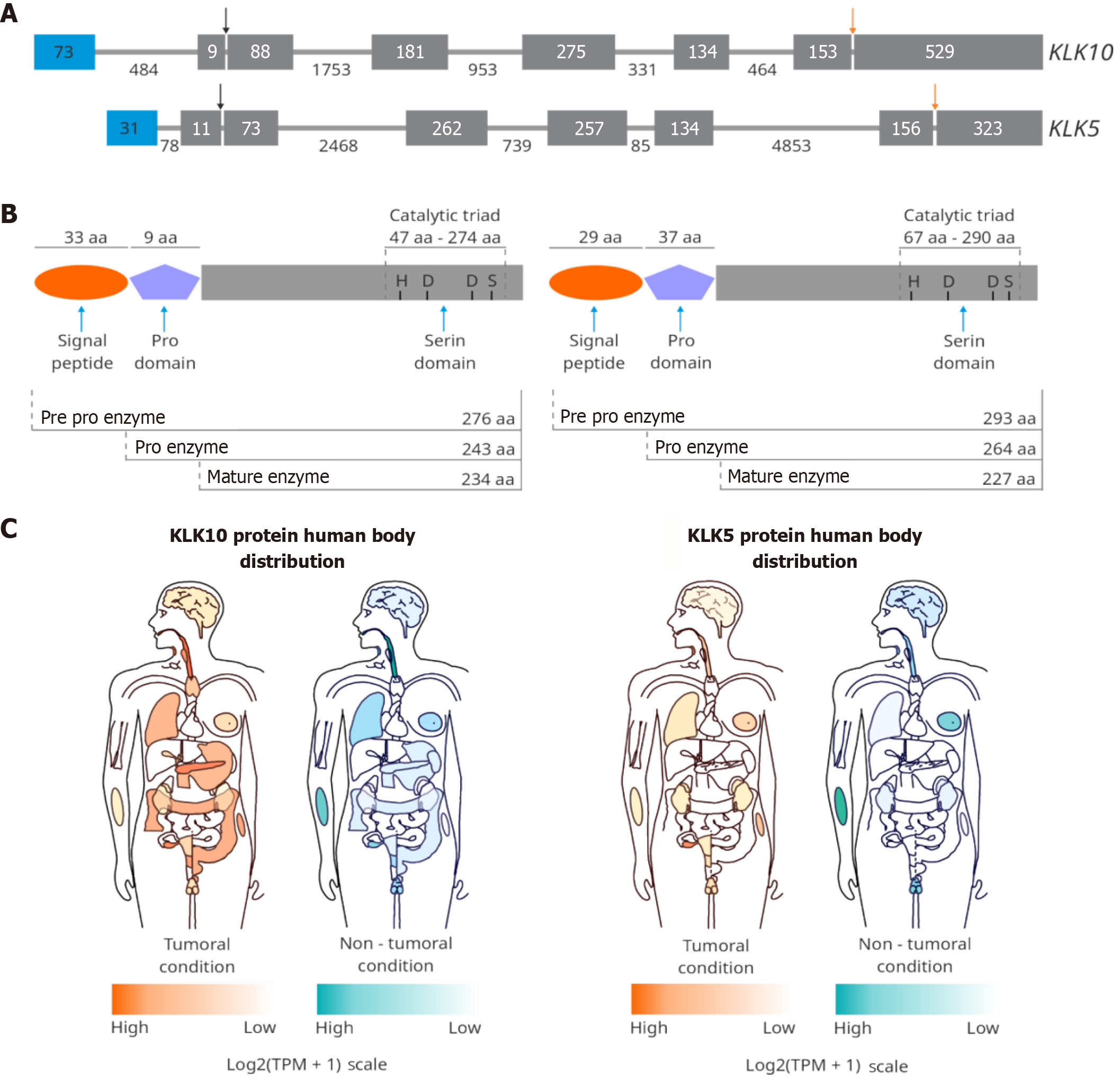 The blue color represents healthy conditions, and the orange color represents tumor conditions. A higher intensity of color correlated with a higher expression of kallikrein-related peptidases (KLK) 10 or KLK5 in the indicated organ. A: KLK10 and KLK5 gene structure. Both genes have five coding exons (gray boxes) and one non-coding exon (blue boxes). The length (in base pairs) of exons and introns is indicated inside and outside the boxes, respectively. The black row represents the position of the start codon, and the orange row indicates the stop codon’s position; B: Protein structure of KLK10 and KLK5; C: Schema modified of GEPIA web server for the expression of KLK10 and KLK5 in the human body. Citation: Tang Z, Li C, Kang B, Gao G, Li C, Zhang Z. GEPIA: A web server for cancer and normal gene expression profiling and interactive analyses. Nucleic Acids Res 2017; 45: W98-W102. Copyright ©The Authors 2025. Published by Oxford University Press. (https://academic.oup.com/pages/open-research/open-access). KLK: Kallikrein-related peptidases; TPM: Transcripts per million.