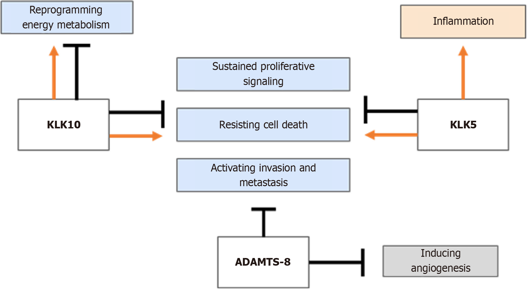 Orange arrow indicates promotion, and the black line indicates inhibition. Both lines (orange and black) indicate the association between a hallmark of cancer and these proteases, depending on the cellular context. ADAMTS-8: ADAM metallopeptidase with thrombospondin type 1 motif 8; KLK: Kallikrein-related peptidases.