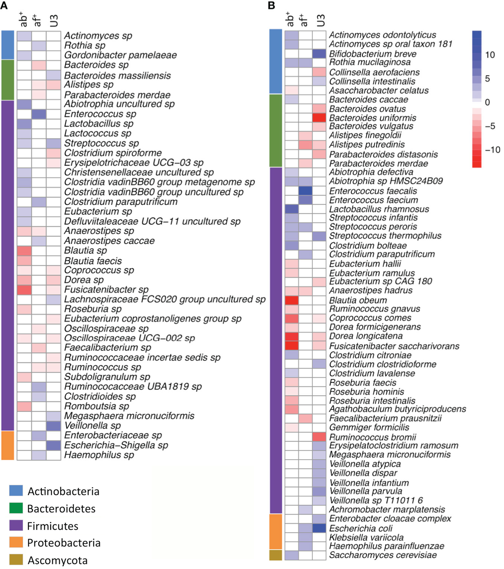 A: 16S rRNA gene sequencing data; B: Whole shotgun metagenome sequencing data. Heatmaps showing bacterial taxa significantly associated with antibiotic use (ab+), antifungal use (af+), and age category (under 3 years of age, U3) using 16S rRNA gene sequencing data and whole shotgun metagenome sequencing data. Blue indicates taxa that increased with treatment or younger age; red indicates taxa that decreased with treatment or younger age. Taxa are organized by phylum, as indicated in the adjacent color bar. Note the consistent depletion of beneficial short-chain fatty acid-producing bacteria (Faecalibacterium, Anaerostipes, Dorea, Blautia) and the enrichment of opportunistic pathogens following antimicrobial treatment across both methodologies. Citation: Dunn KA, MacDonald T, Rodrigues GJ, Forbrigger Z, Bielawski JP, Langille MGI, Van Limbergen J, Kulkarni K. Antibiotic and antifungal use in pediatric leukemia and lymphoma patients are associated with increasing opportunistic pathogens and decreasing bacteria responsible for activities that enhance colonic defense. Front Cell Infect Microbiol 2022; 12: 924707. Copyright ©The Author(s) 2022. Published by Frontiers Media S.A (Supplementary material).