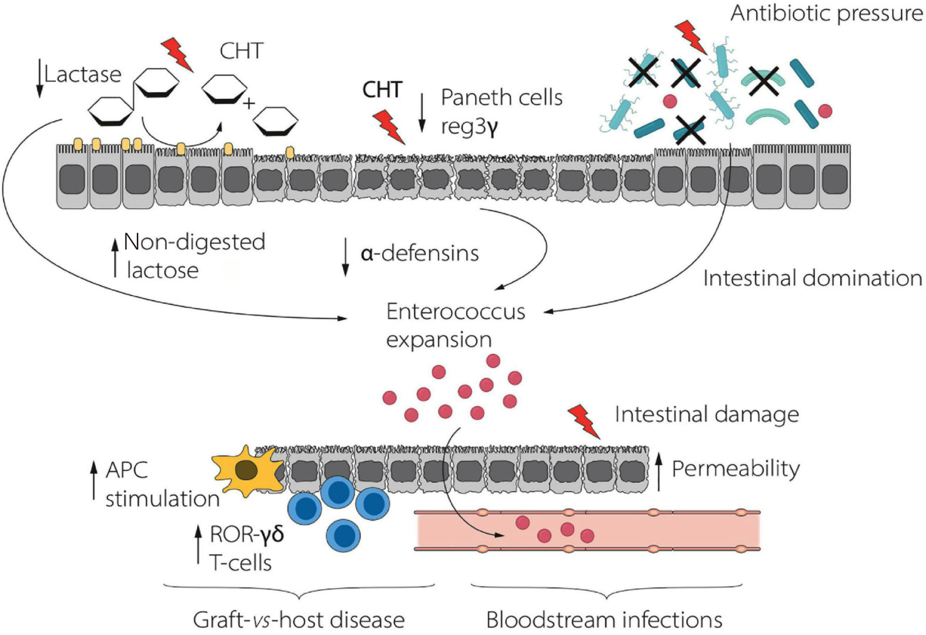 Dietary lactose that is unabsorbed due to conditioning-induced lactase loss accumulates in the gut lumen and serves as a substrate for Enterococcus species, leading to intestinal domination, enhanced mucosal barrier disruption, and an increased risk of acute graft-versus-host disease and bloodstream infections. Lactose avoidance or enzymatic supplementation restores community balance and reduces transplant-related complications. APC: Antigen presenting cell; CHT: Chemotherapy. Citation: Muratore E, Leardini D, Baccelli F, Venturelli F, Prete A, Masetti R. Nutritional modulation of the gut microbiome in allogeneic hematopoietic stem cell transplantation recipients. Front Nutr 2022; 9: 993668. Copyright ©The Author(s) 2022. Published by Frontiers Media S.A (Supplementary material).