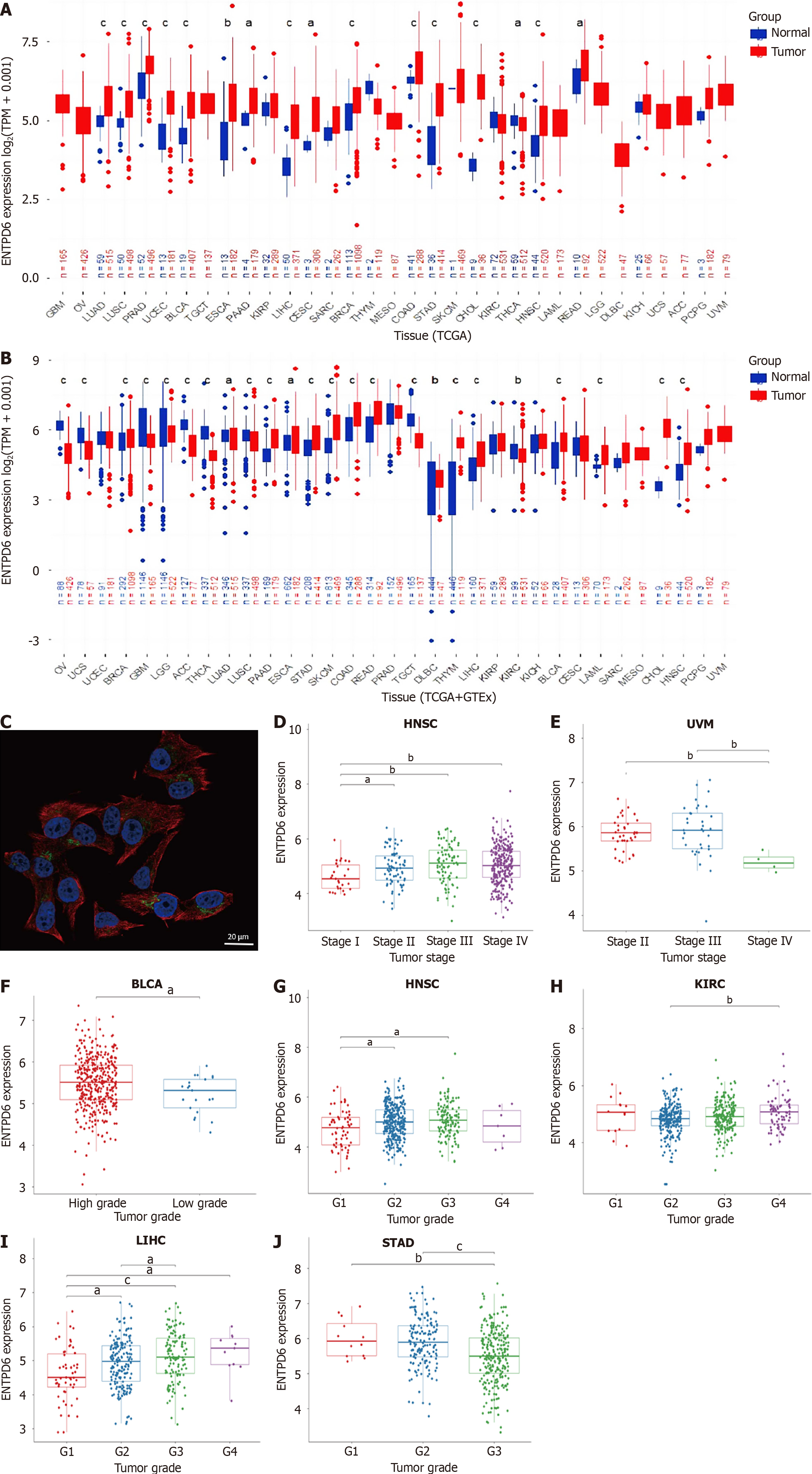 A: Ectonucleoside triphosphate diphosphohydrolase 6 (ENTPD6) expression levels both in the tumor and normal tissues from The Cancer Genome Atlas dataset; B: ENTPD6 expression levels in the paired tumor/normal samples of the datasets from The Cancer Genome Atlas and Genotype-Tissue Expression databases; C: Subcellular localization of ENTPD6 in SK-MEL-30 cell line from The Human Protein Atlas database, scale bar: 20 μm. Red, green, and blue represent microtubules, the target protein, and the nucleus, respectively; D and E: The association between ENTPD6 expression and pathological stages in head and neck squamous cell carcinoma and uveal melanoma; F-J: ENTPD6 expression correlated with tumor grades in bladder urothelial carcinoma, head and neck squamous cell carcinoma, kidney renal clear cell carcinoma, liver hepatocellular carcinoma, and stomach adenocarcinoma. aP < 0.05; bP < 0.01; cP < 0.001. ENTPD6: Ectonucleoside triphosphate diphosphohydrolase 6; TPM: Transcripts per million; TCGA: The Cancer Genome Atlas; GTEx: Genotype-Tissue Expression; HNSC: Head and neck squamous cell carcinoma; UVM: Uveal melanoma; BLCA: Bladder urothelial carcinoma; KIRC: Kidney renal clear cell carcinoma; LIHC: Liver hepatocellular carcinoma; STAD: Stomach adenocarcinoma.