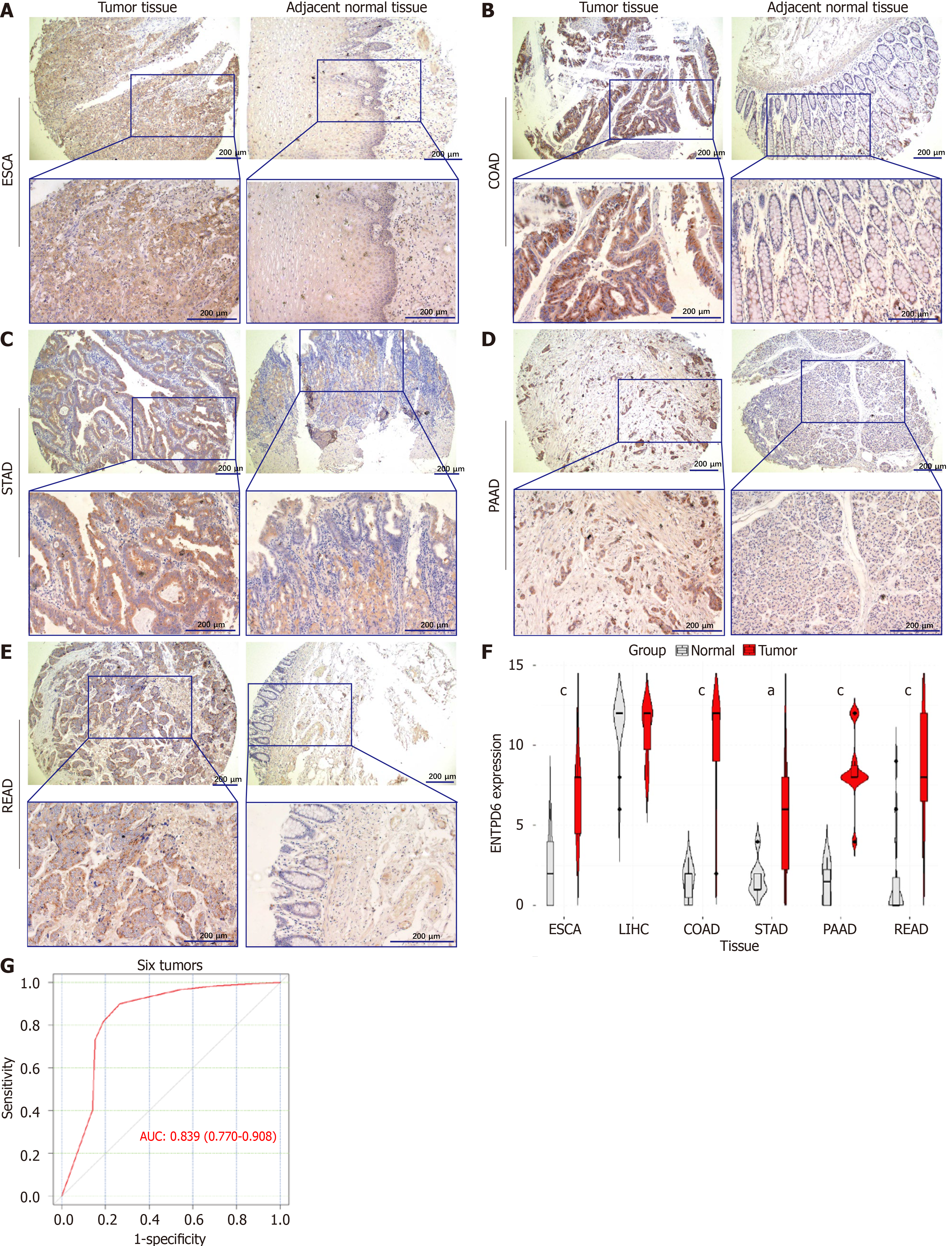 A-E: Immunohistochemistry staining results of ectonucleoside triphosphate diphosphohydrolase 6 (ENTPD6) expression in gastrointestinal tumors and adjacent normal tissues, including esophageal carcinoma, colon adenocarcinoma, stomach adenocarcinoma, pancreatic adenocarcinoma, rectal adenocarcinoma, scale bar: 200 μm; F: Differential expression plot of ENTPD6; G: The receiver operating characteristic curve and area under the curve value of ENTPD6 in six tumors. aP < 0.05; cP < 0.001. ESCA: Esophageal carcinoma; COAD: Colon adenocarcinoma; STAD: Stomach adenocarcinoma; PAAD: Pancreatic adenocarcinoma; READ: Rectal adenocarcinoma; ENTPD6: Ectonucleoside triphosphate diphosphohydrolase 6; AUC: Area under the curve.
