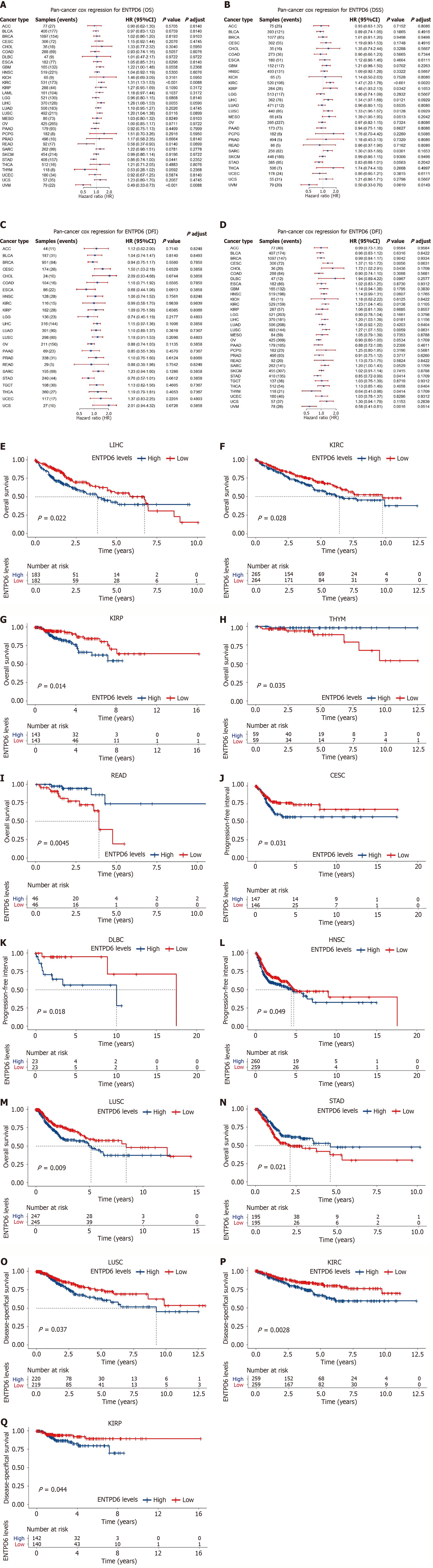 A-D: The univariate Cox regression analysis of overall survival, disease-specific survival, disease-free interval, and progression-free interval; E-I: The results of Kaplan-Meier curves analysis of overall survival in liver hepatocellular carcinoma, kidney renal clear cell carcinoma, kidney renal papillary cell carcinoma, thymoma, and rectal adenocarcinoma; J-N: The results of the Kaplan-Meier curves analysis of progression-free interval in cervical squamous cell carcinoma and endocervical adenocarcinoma, diffuse large B-cell lymphoma, head and neck squamous cell carcinoma, lung squamous cell carcinoma, and stomach adenocarcinoma; O-Q: The results of the Kaplan-Meier curves analysis of disease-specific survival in lung squamous cell carcinoma, kidney renal papillary cell carcinoma, and kidney renal clear cell carcinoma. ENTPD6: Ectonucleoside triphosphate diphosphohydrolase 6; OS: Overall survival; DSS: Disease-specific survival; DFI: Disease-free interval; PFI: Progression-free interval; LIHC: Liver hepatocellular carcinoma; KIRC: Kidney renal clear cell carcinoma; KIRP: Kidney renal papillary cell carcinoma; THYM: Thymoma; READ: Rectal adenocarcinoma; CESC: Cervical squamous cell carcinoma and endocervical adenocarcinoma; DLBC: Diffuse large B-cell lymphoma; HNSC: Head and neck squamous cell carcinoma; LUSC: Lung squamous cell carcinoma; STAD: Stomach adenocarcinoma.