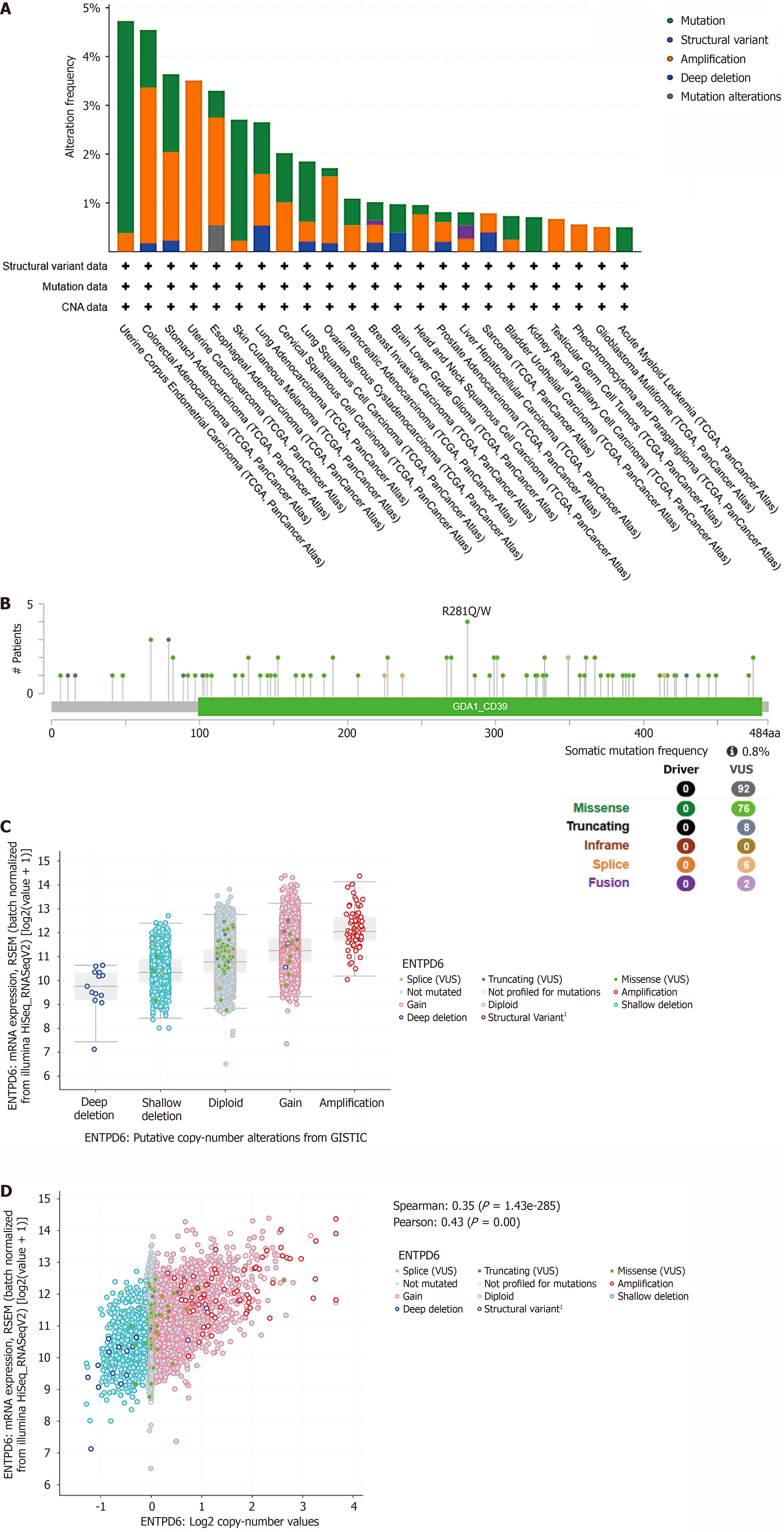 A: Pan-cancer analyses of genomic changes in ectonucleoside triphosphate diphosphohydrolase 6 (ENTPD6) expression were conducted, including analyses of mutations, amplifications, and deep deletions; B: Genetic alterations of ENTPD6, including missense, frameshift deletion, and splice site mutations; C: ENTPD6 expression in different copy number alteration categories; D: The correlation between copy number alteration and ENTPD6 expression. CAN: Copy number alteration; VUS: Variant of uncertain significance; ENTPD6: Ectonucleoside triphosphate diphosphohydrolase 6; RSEM: RNA-Seq by Expectation Maximization; GSTIC: Genomic Identification of Significant Targets in Cancer.