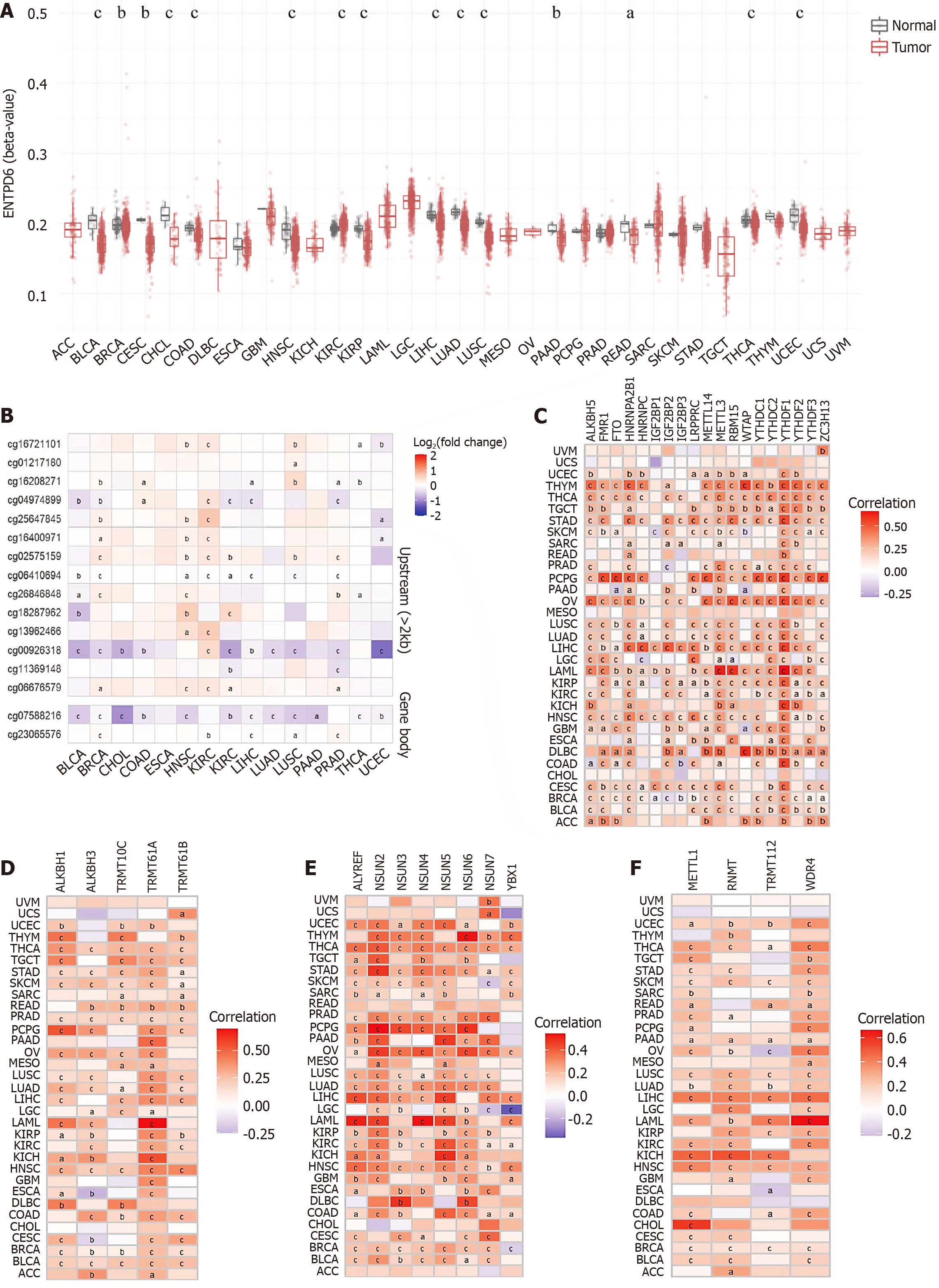 A: The DNA methylation levels of ectonucleoside triphosphate diphosphohydrolase 6 (ENTPD6) were obtained from the Shiny Methylation Analysis Resource Tool database; B: Differential methylation of DNA methylation probes in upstream (> 2 kb) and gene body regions of ENTPD6; C-F: Correlation analysis between ENTPD6 expression and the genes related to m6A, m1A, m5C, and m7G modifications. aP < 0.05; bP < 0.01; cP < 0.001. ENTPD6: Ectonucleoside triphosphate diphosphohydrolase 6.