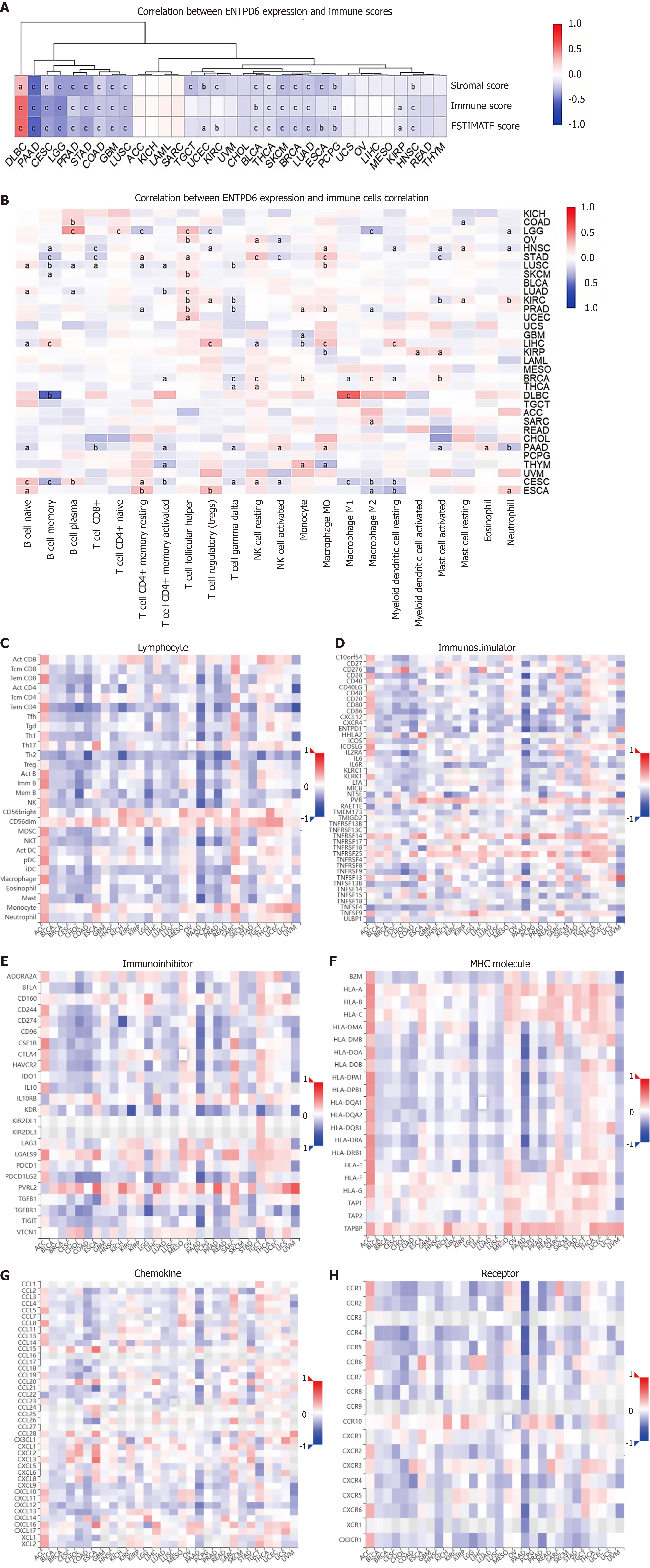 A: The relationship between ectonucleoside triphosphate diphosphohydrolase 6 (ENTPD6) expression levels and Estimation of STromal and Immune cells in MAlignant Tumor tissues using Expression data scores, immune scores, and stromal scores; B: The correlation between ENTPD6 expression and immune cells; C-H: The relationships between ENTPD6 expression and immune-related genes in the tumor-immune system interaction database, including lymphocyte, immunostimulator, immunoinhibitor, major histocompatibility complex molecule, chemokine, and receptor. aP < 0.05; bP < 0.01; cP < 0.001. ENTPD6: Ectonucleoside triphosphate diphosphohydrolase 6; MHC: Major histocompatibility complex molecule.