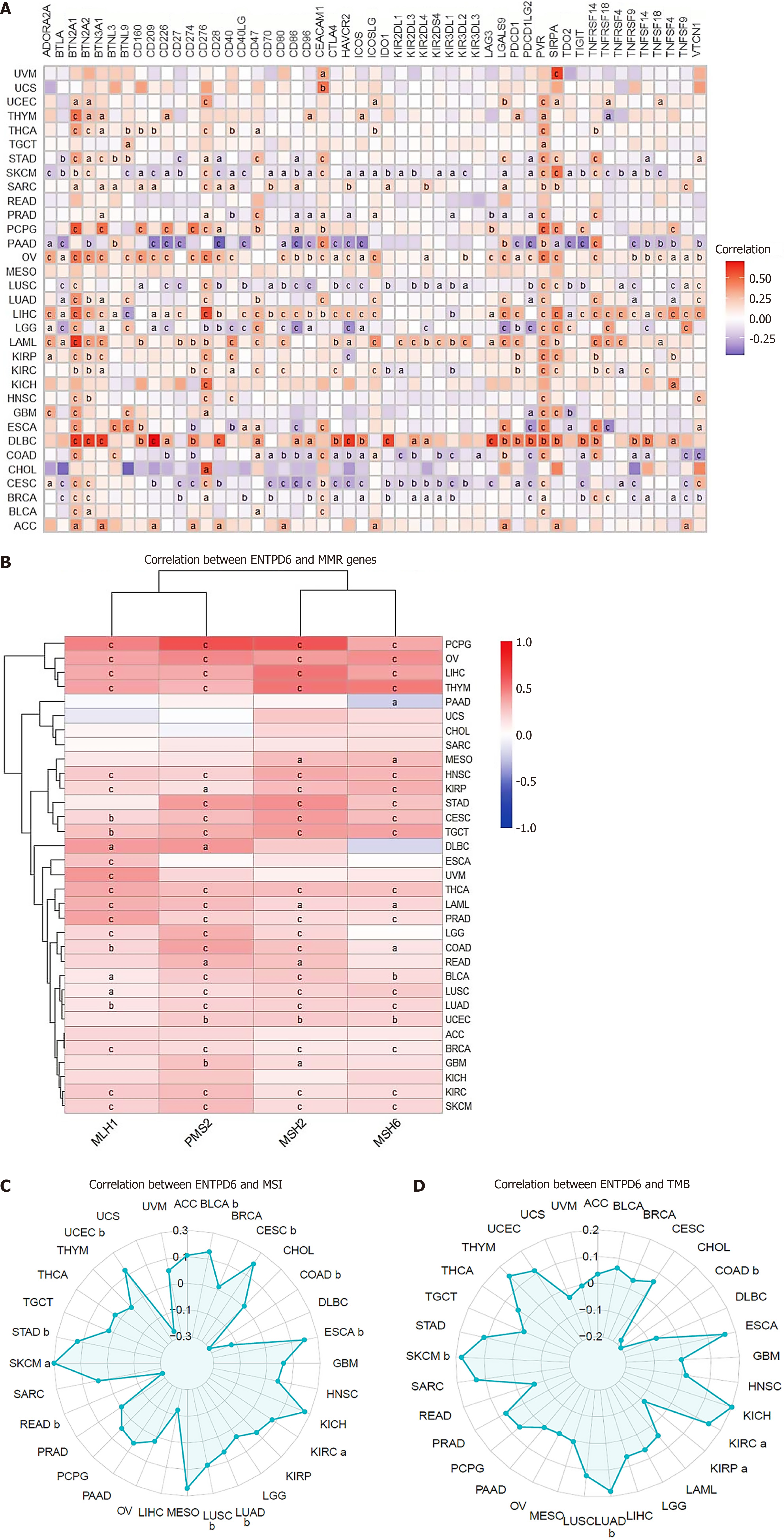 A: The association between ectonucleoside triphosphate diphosphohydrolase 6 expression and 51 immune checkpoint genes; B-D: Mismatch repair genes, microsatellite instability, as well as tumor mutational burden. aP < 0.05; bP < 0.01; cP < 0.001. ENTPD6: Ectonucleoside triphosphate diphosphohydrolase 6; MMR: Mismatch repair; MSI: Microsatellite instability; TMB: Tumor mutational burden.